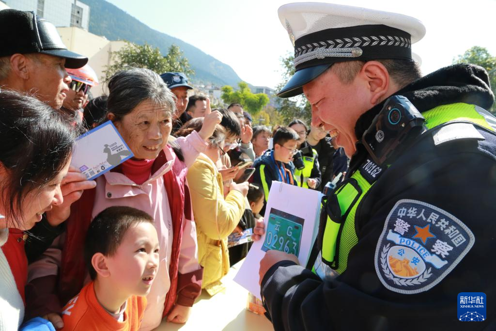 1月10日,在云南省个旧市工人文化宫,个旧市公安局民警与市民进行交通安全知识有奖问答互动。