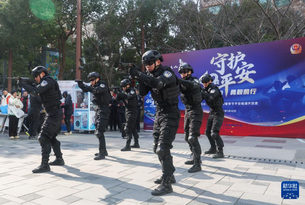 1月10日,上海市公安局杨浦分局民警在“平安杨浦开放麦”活动现场进行枪操战术展示。