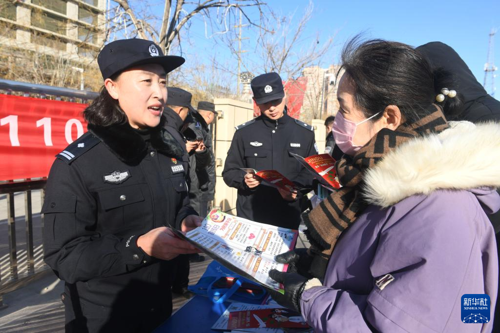 1月10日,在河北省石家庄新乐市文化广场,新乐市公安局民警为群众讲解报警知识。