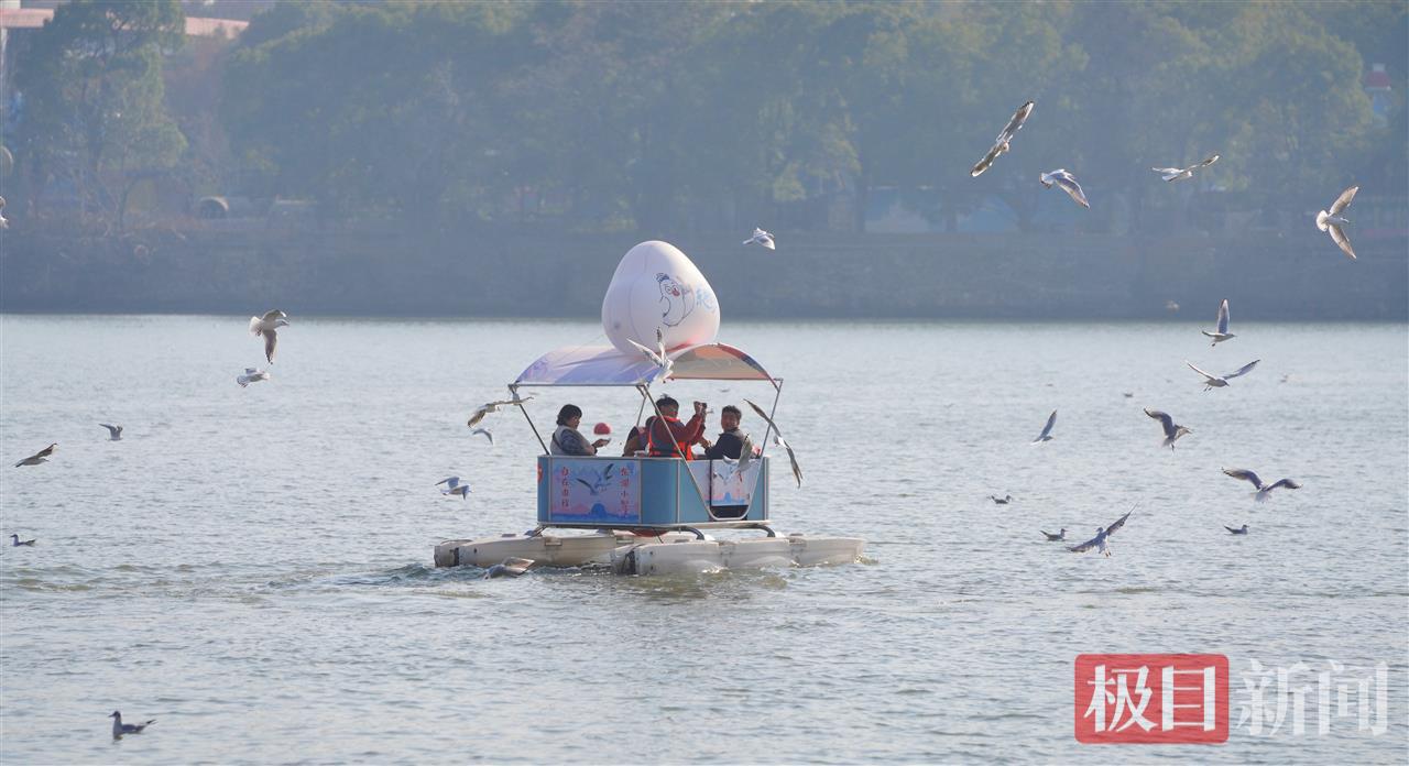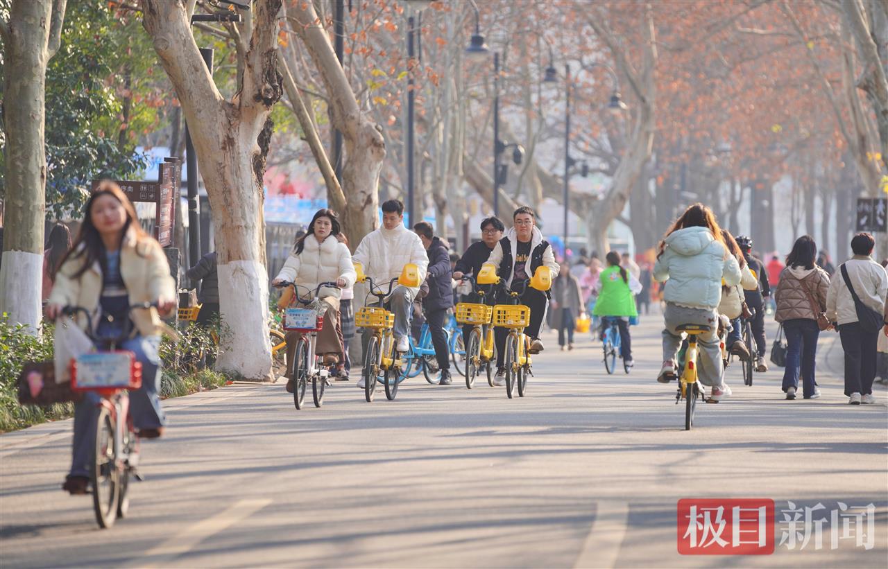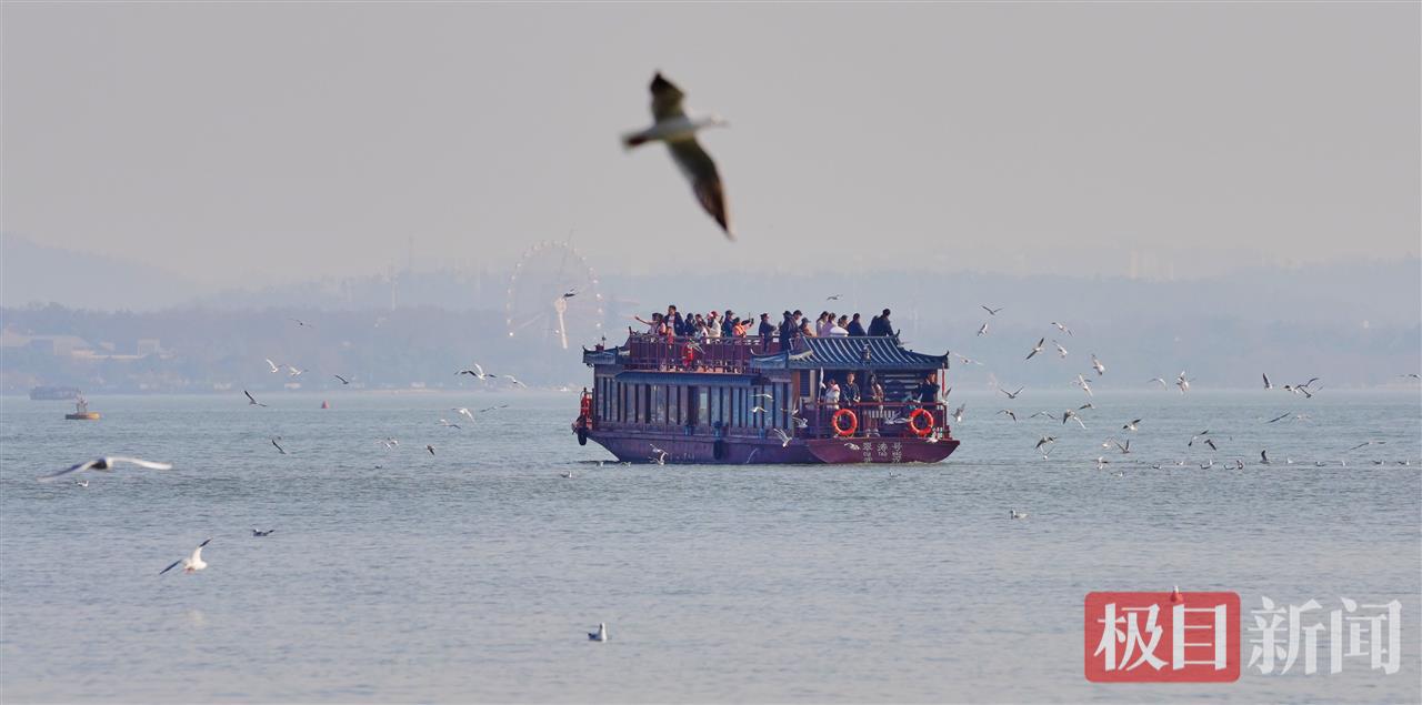 1月13日,武汉市最高温达20℃。当日下午2时许,东湖绿道人头攒动,游客或沿湖骑行感受暖风拂面,或驻足拍照记录湖光山色。湖面上,从西伯利亚远道而来越冬的红嘴鸥翩跹起舞,与游船、游客共绘冬日生态画卷。