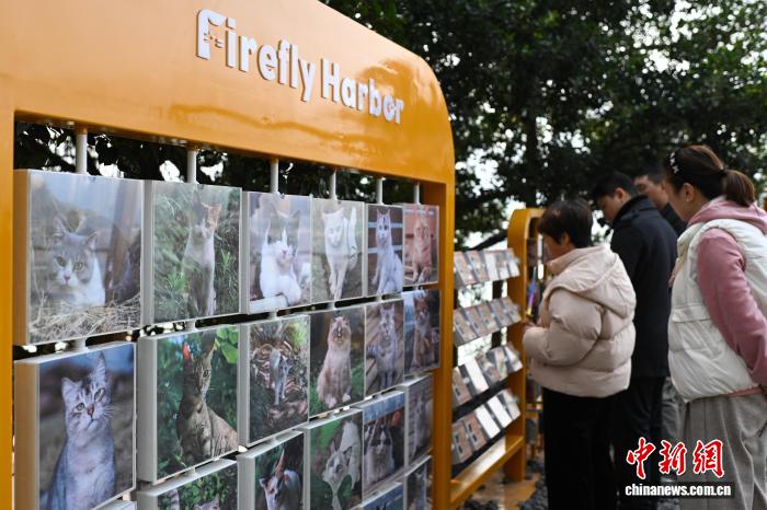 1月13日,游客观看重庆萤火虫港湾猫猫主题乐园展示的流浪猫照片与档案。 中新社记者何蓬磊摄