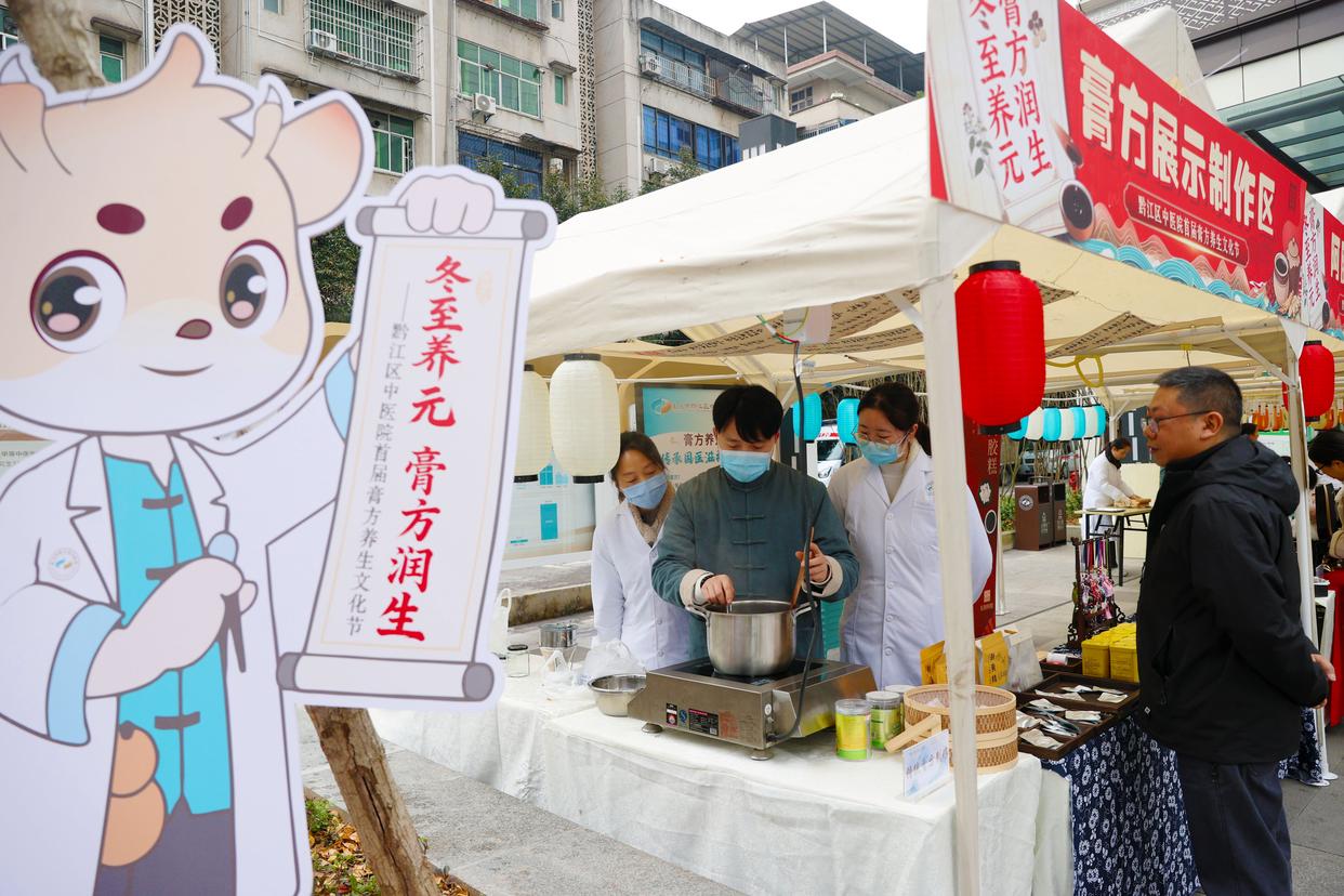 2025年12月21日是冬至,重庆市黔江区中医医院医务人员在养生文化节活动现场制作冬至养元膏方。 新华社发(杨敏摄)