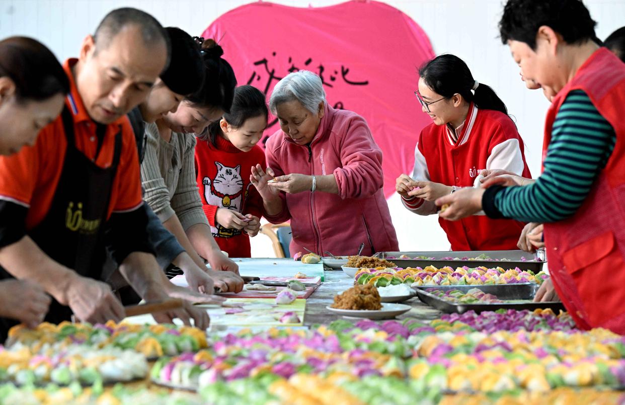 2025年12月21日是冬至,在河北省石家庄市新华区一家养老公寓,社区志愿者与老人一起包饺子。新华社发(陈其保摄)