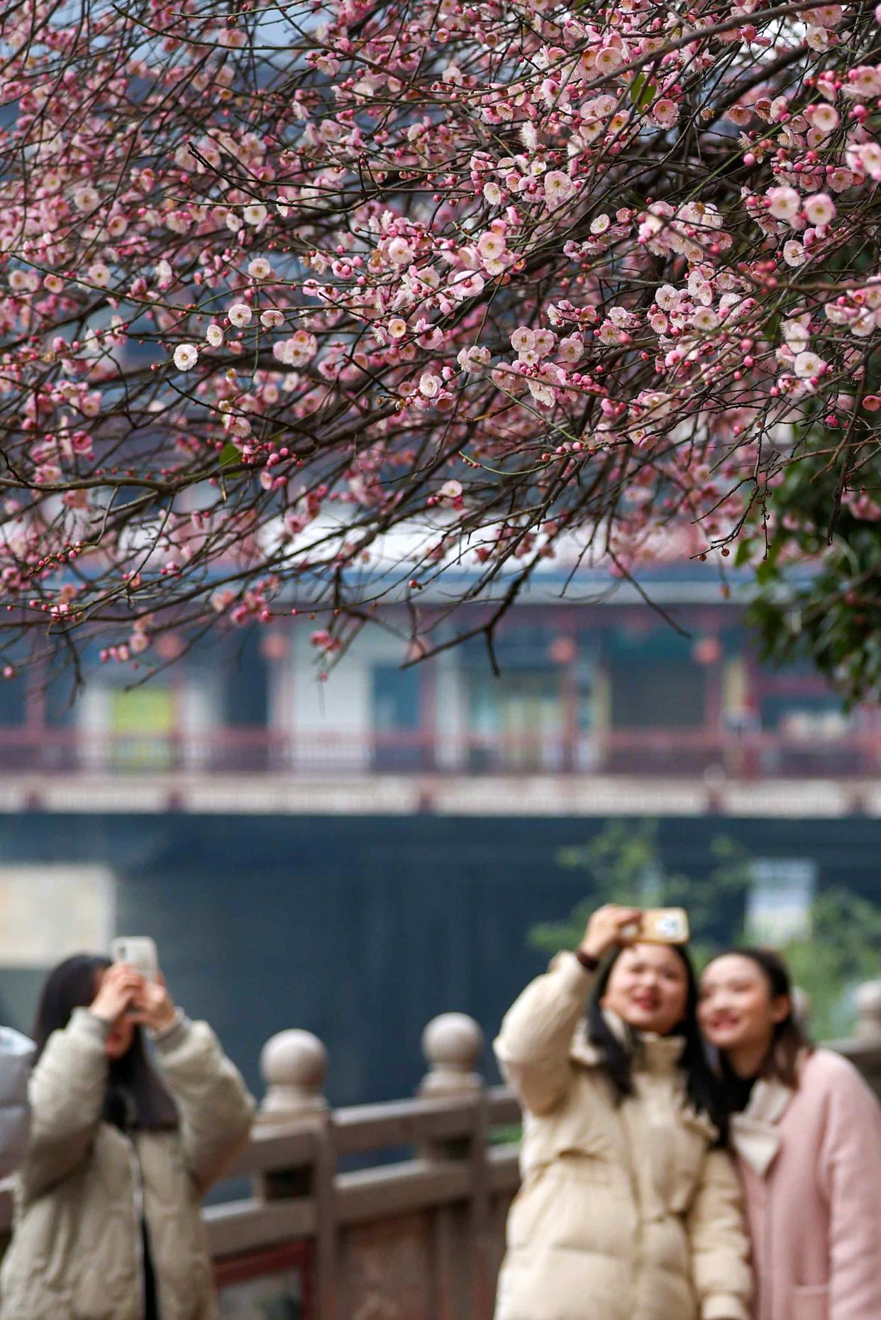 2026年1月5日,在贵州省铜仁市玉屏侗族自治县,人们拍摄绽放的梅花。新华社发(胡攀学摄)