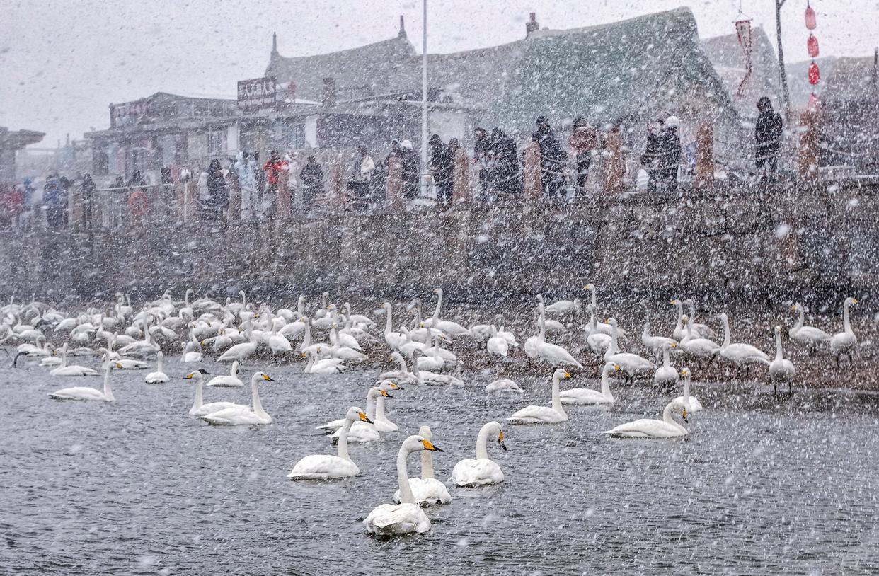2026年1月10日,在山东省荣成市俚岛镇烟墩角村,游客冒雪观赏大天鹅(无人机照片)。新华社发(李信君摄)