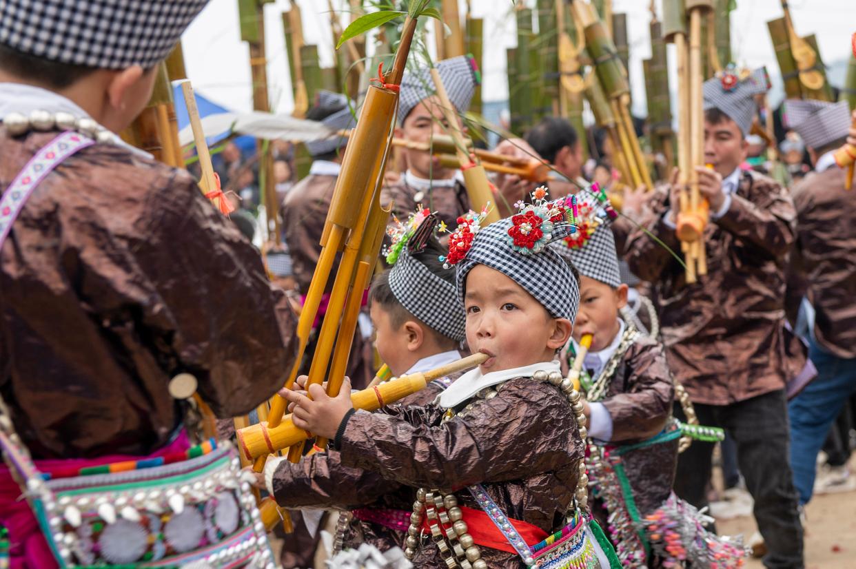 2025年12月21日是冬至,苗族小朋友在贵州省从江县丙妹镇大洞村的芦笙节上吹奏芦笙。新华社发(吴德军摄)