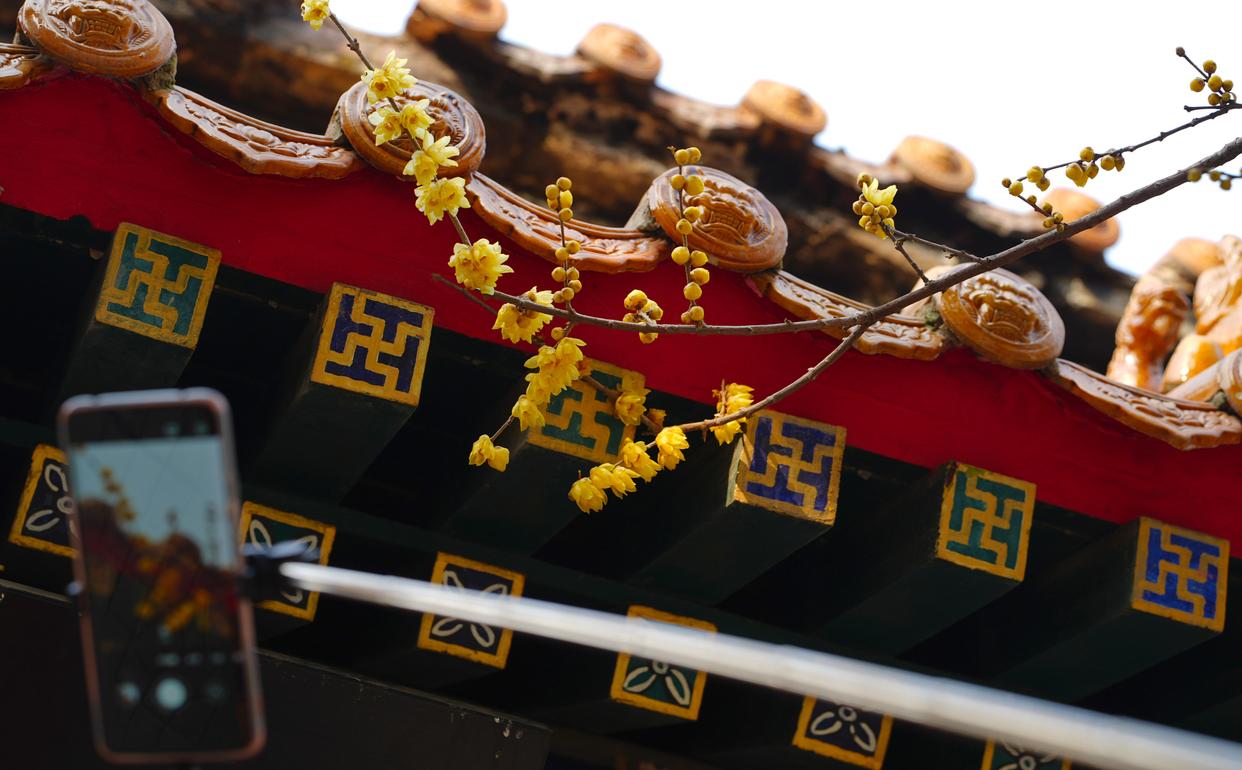 2026年1月5日,在河北省石家庄市鹿泉区十方院,游客用手机拍摄蜡梅。新华社发(闫志国摄)