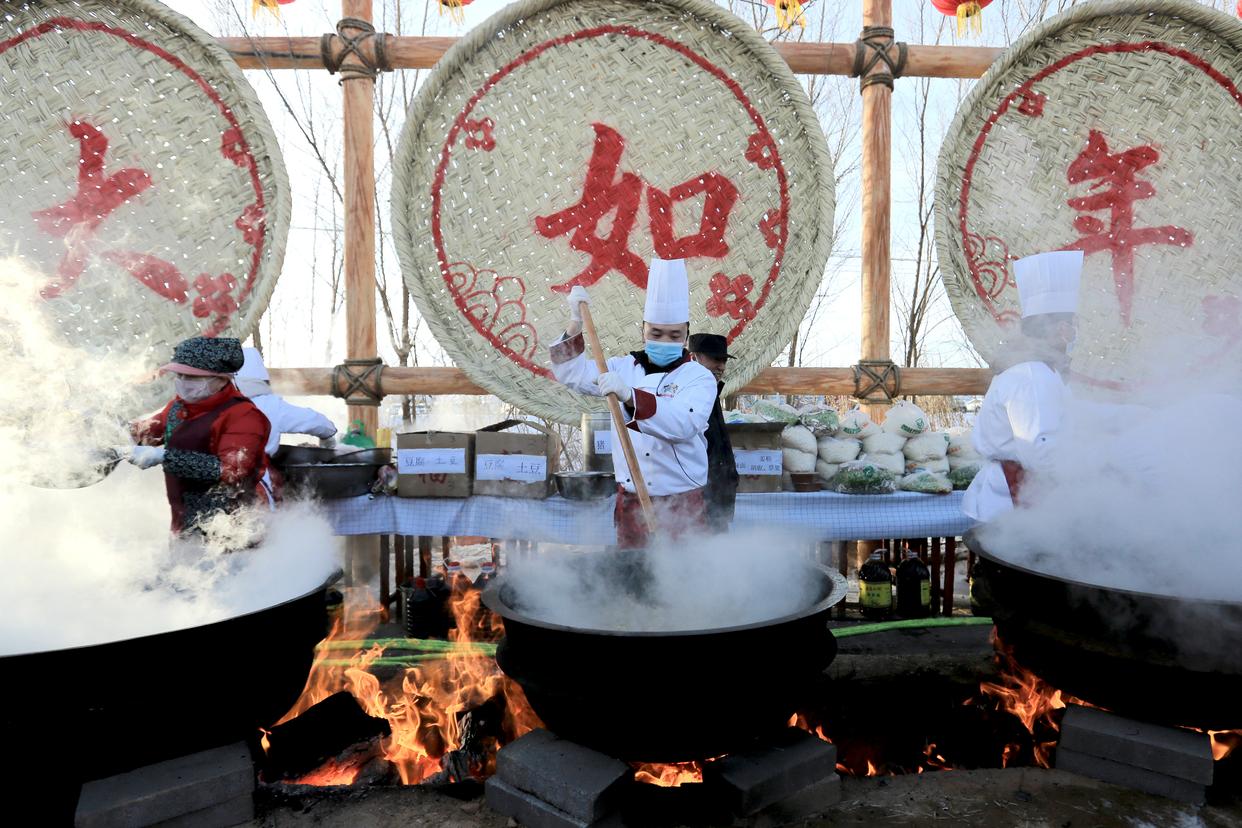 2025年12月21日是冬至,厨师在甘肃省张掖市山丹县清泉镇祁店村制作特色大锅饭“牛娃子饭”,当地有冬至吃“牛娃子饭”的习俗。新华社发(陈礼摄)