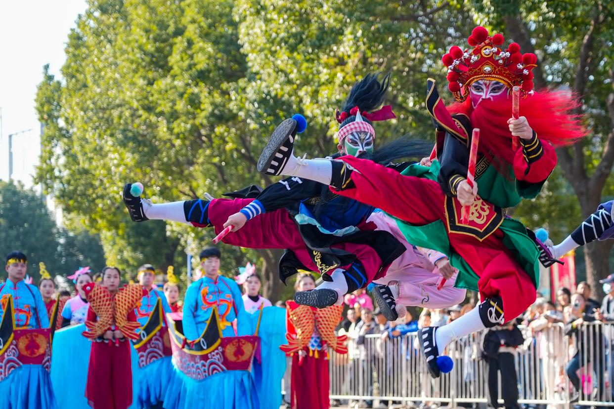 2025年12月20日,在浙江省宁波市镇海区澥浦镇,民间艺人在文化巡游迎冬至活动上表演英歌舞。新华社发(郑凯侠摄)