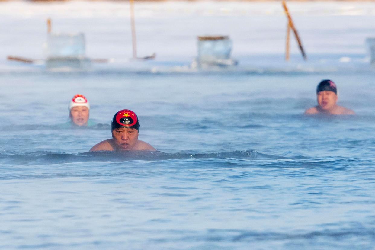 2026年1月13日,黑龙江省齐齐哈尔市冬泳爱好者在严寒中冬泳。新华社发(王勇刚摄)