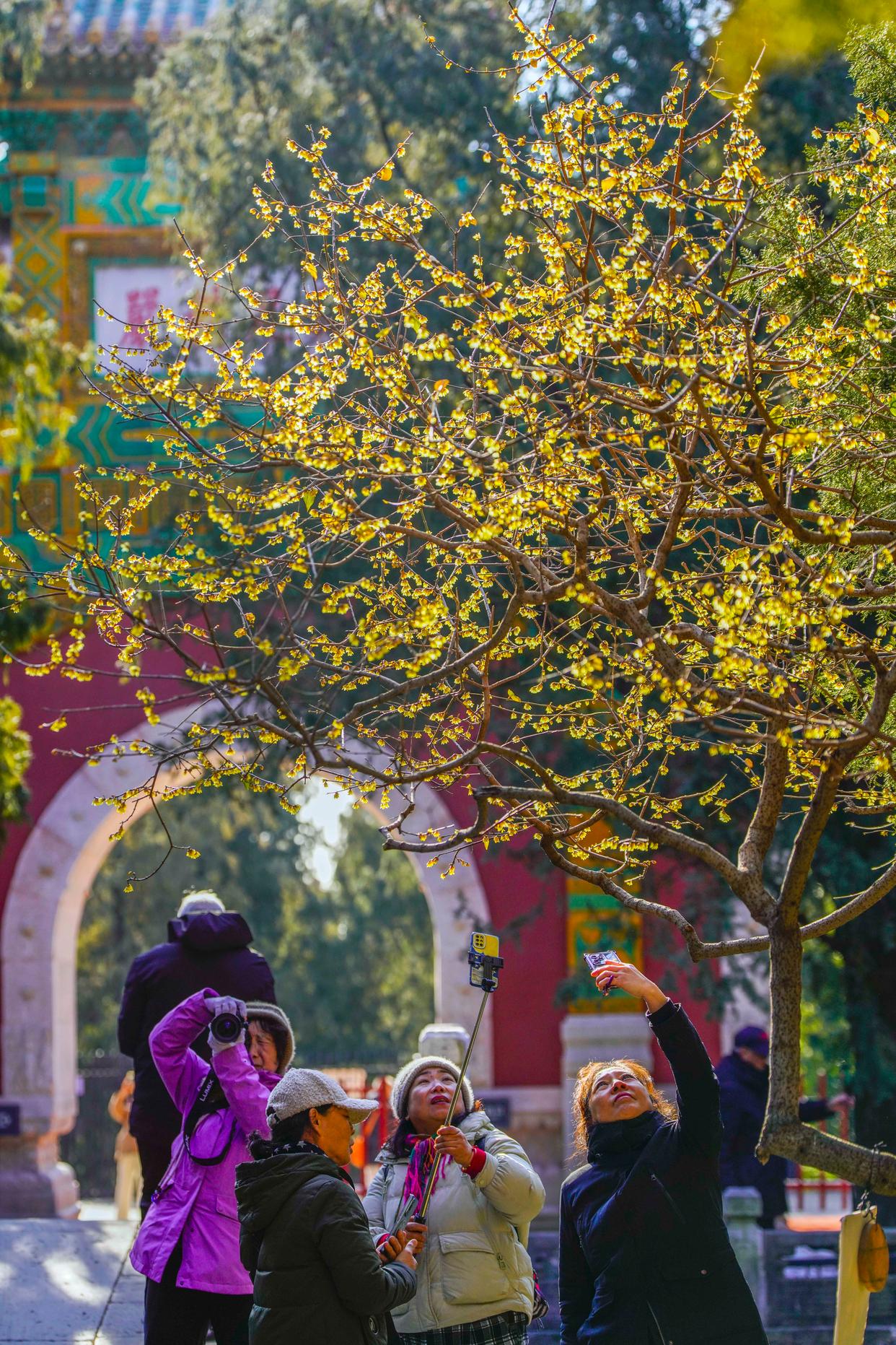 2026年1月8日,人们在北京国家植物园卧佛寺拍摄蜡梅。新华社发(刘满仓摄)