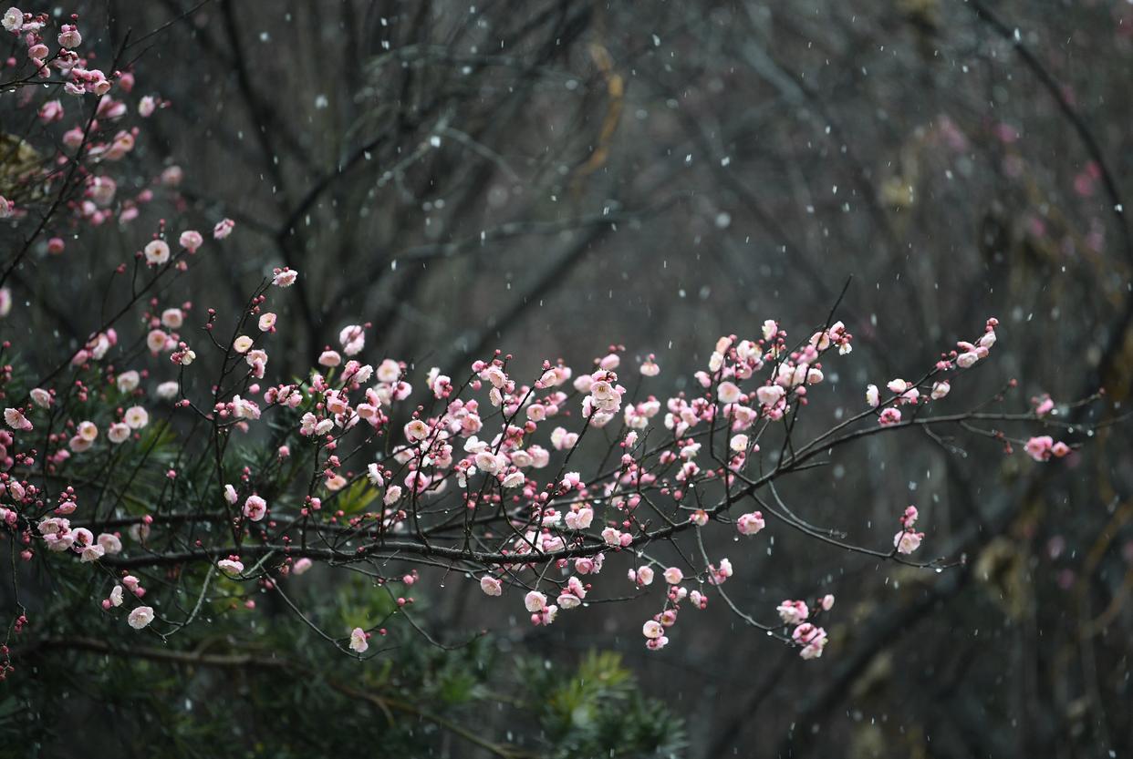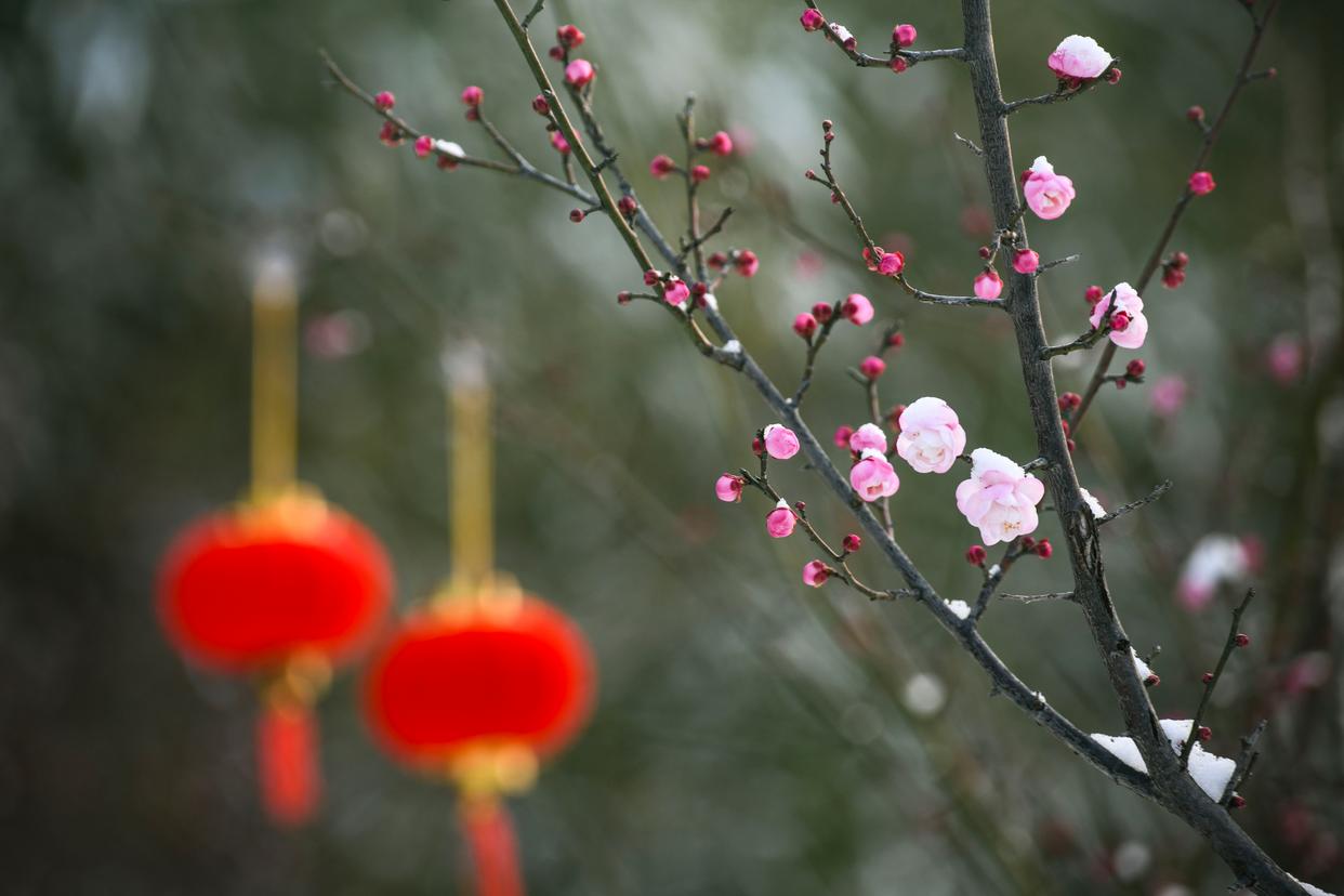 2026年1月1日,在湖北襄阳古隆中风景区,游客拍摄雪后梅花。新华社发(王虎摄)