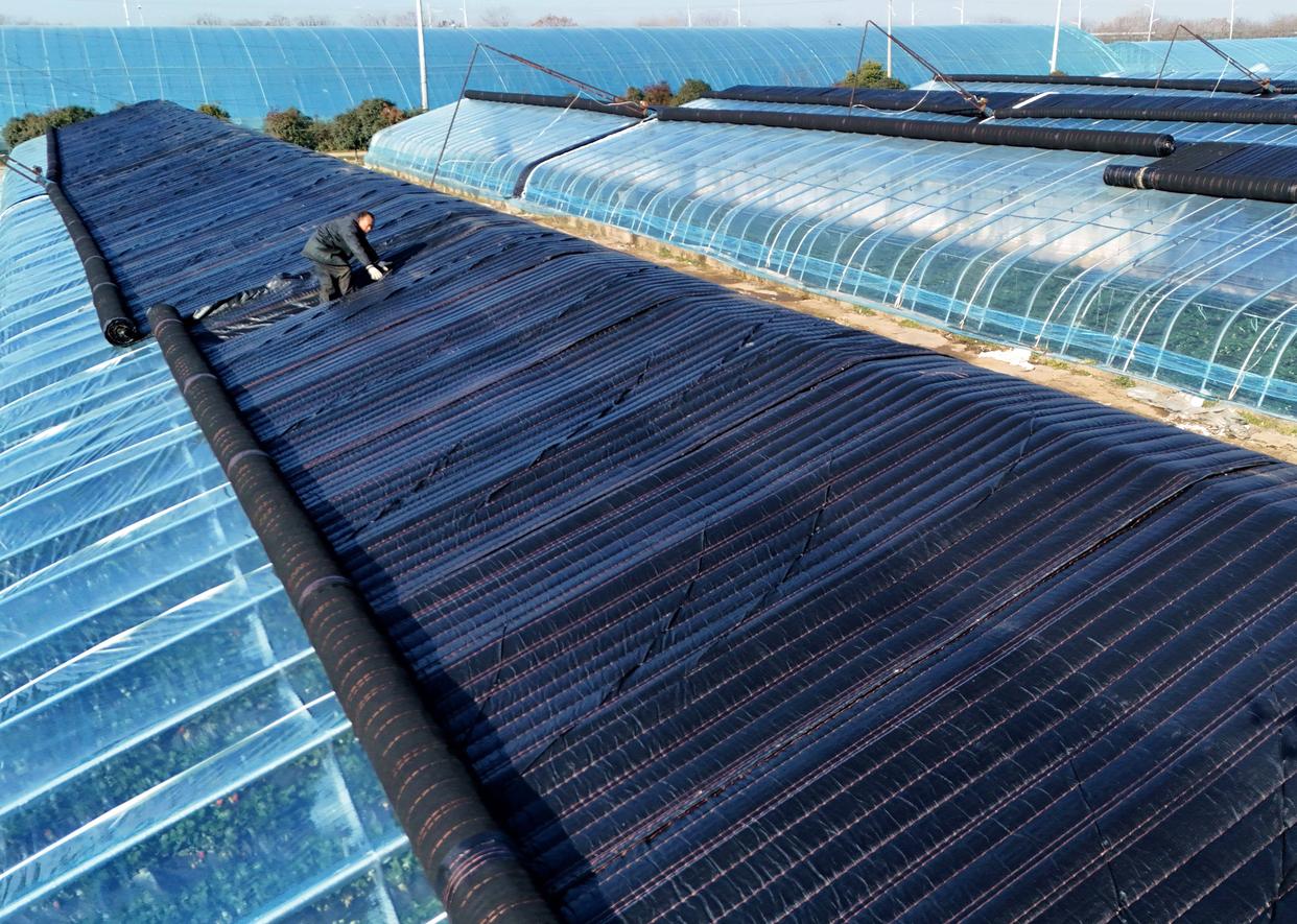 2026年1月7日,河南省南阳市社旗县李店镇一家蔬菜种植基地工作人员为蔬菜大棚铺设保暖设备御寒(无人机照片)。新华社发(高嵩摄)