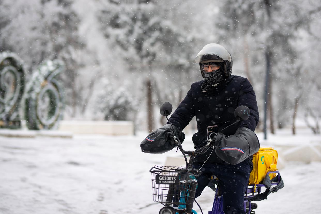 1月16日,一名外卖员骑车经过哈萨克斯坦阿拉木图的一条街道。新华社记者 李任滋 摄