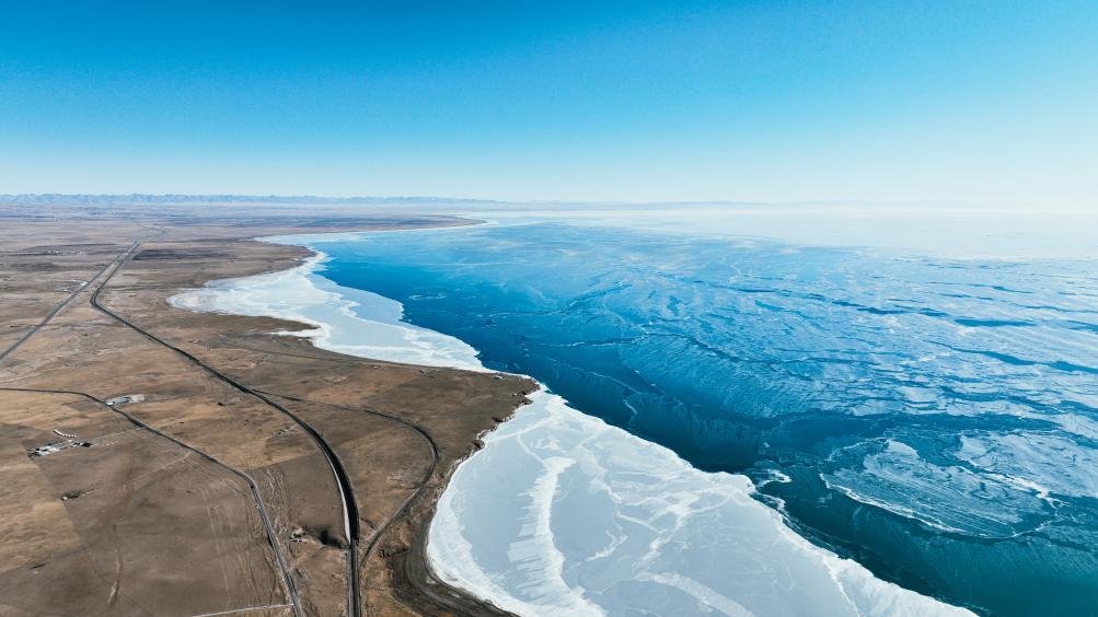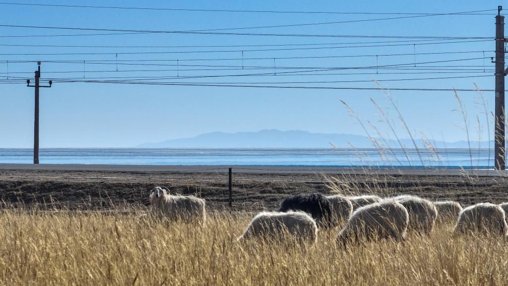 哈尔盖信号工区附近,青海湖、羊群、铁路轨道同框。