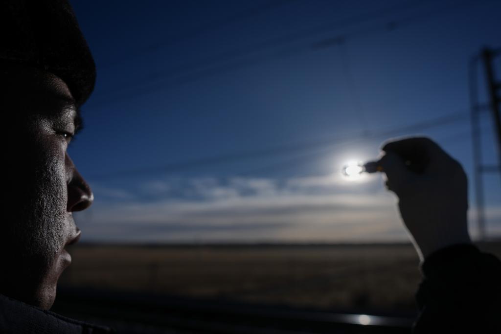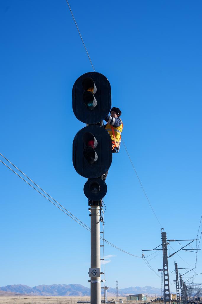 信号工孙伟在哈尔盖信号车间哈尔盖信号工区青海湖站检查信号机灯泡。