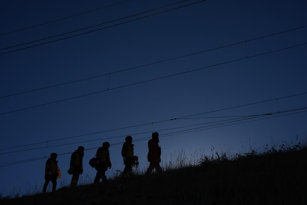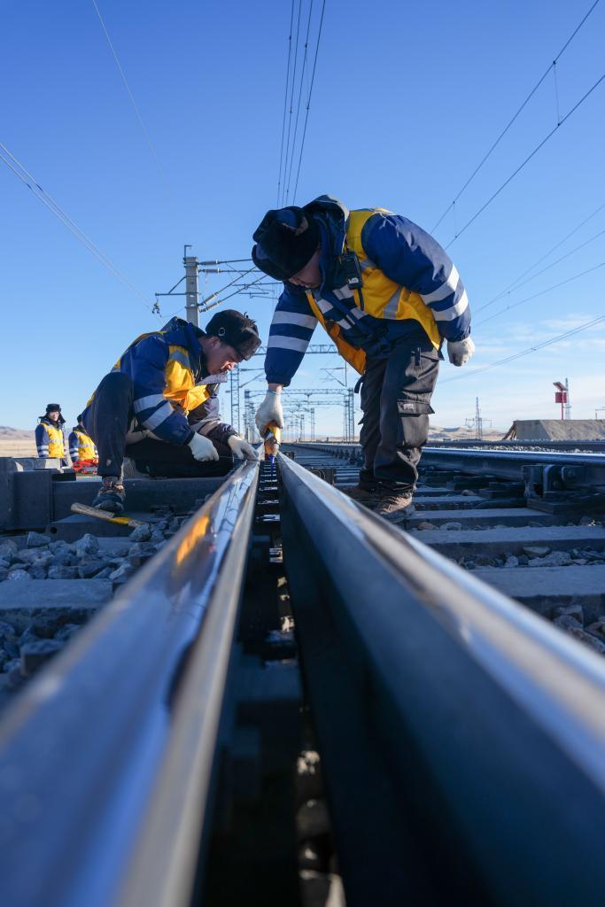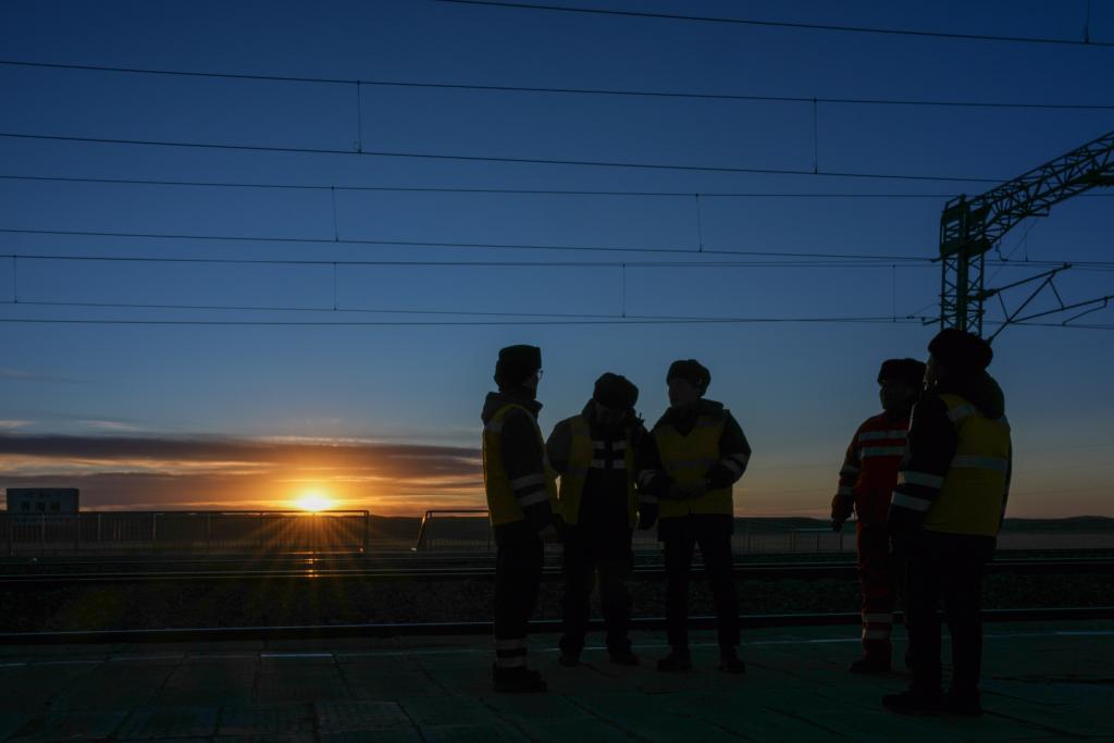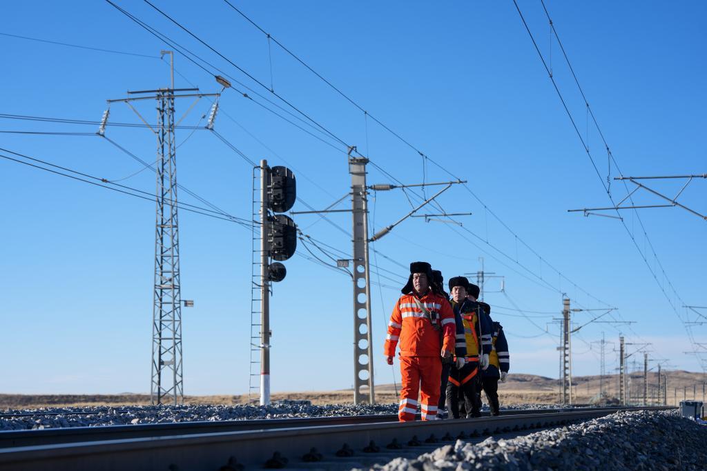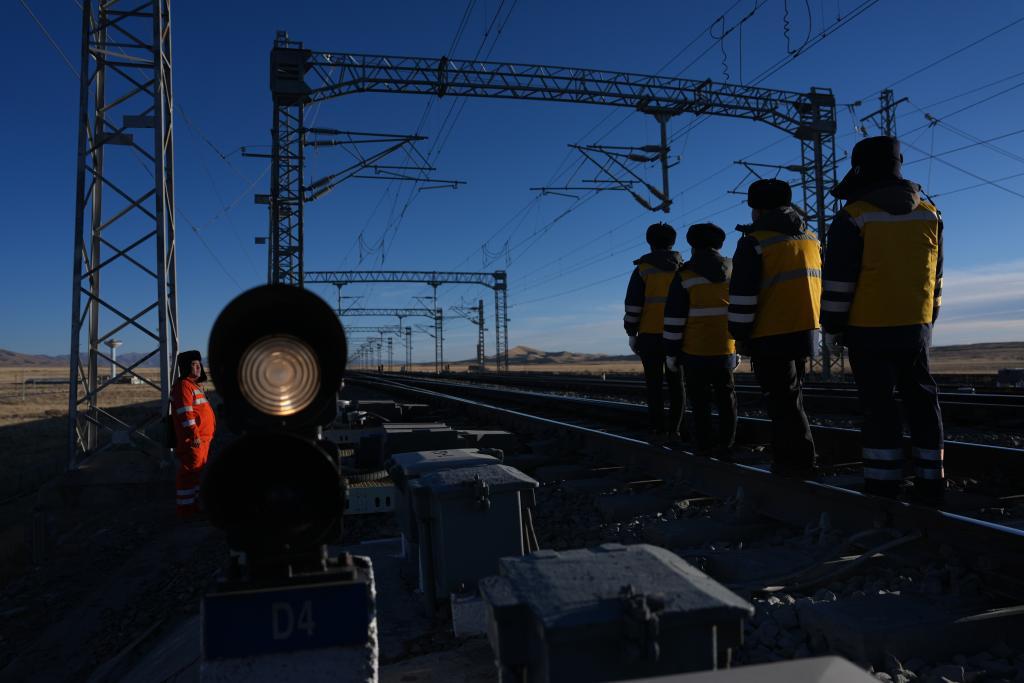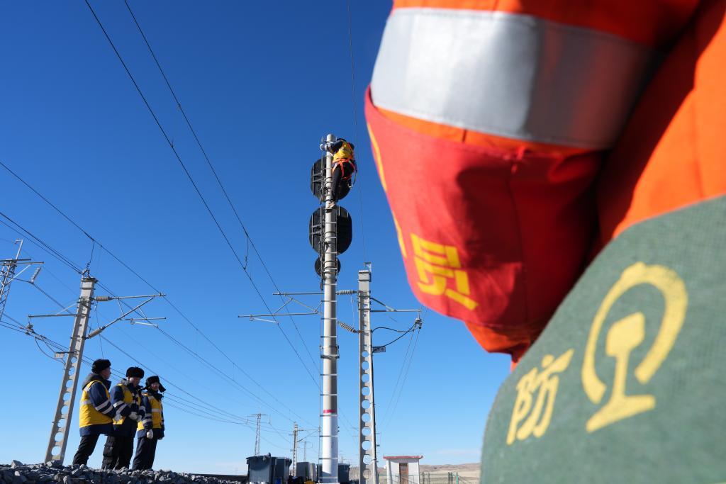 信号工们在哈尔盖信号车间哈尔盖信号工区青海湖站铁轨附近巡检。