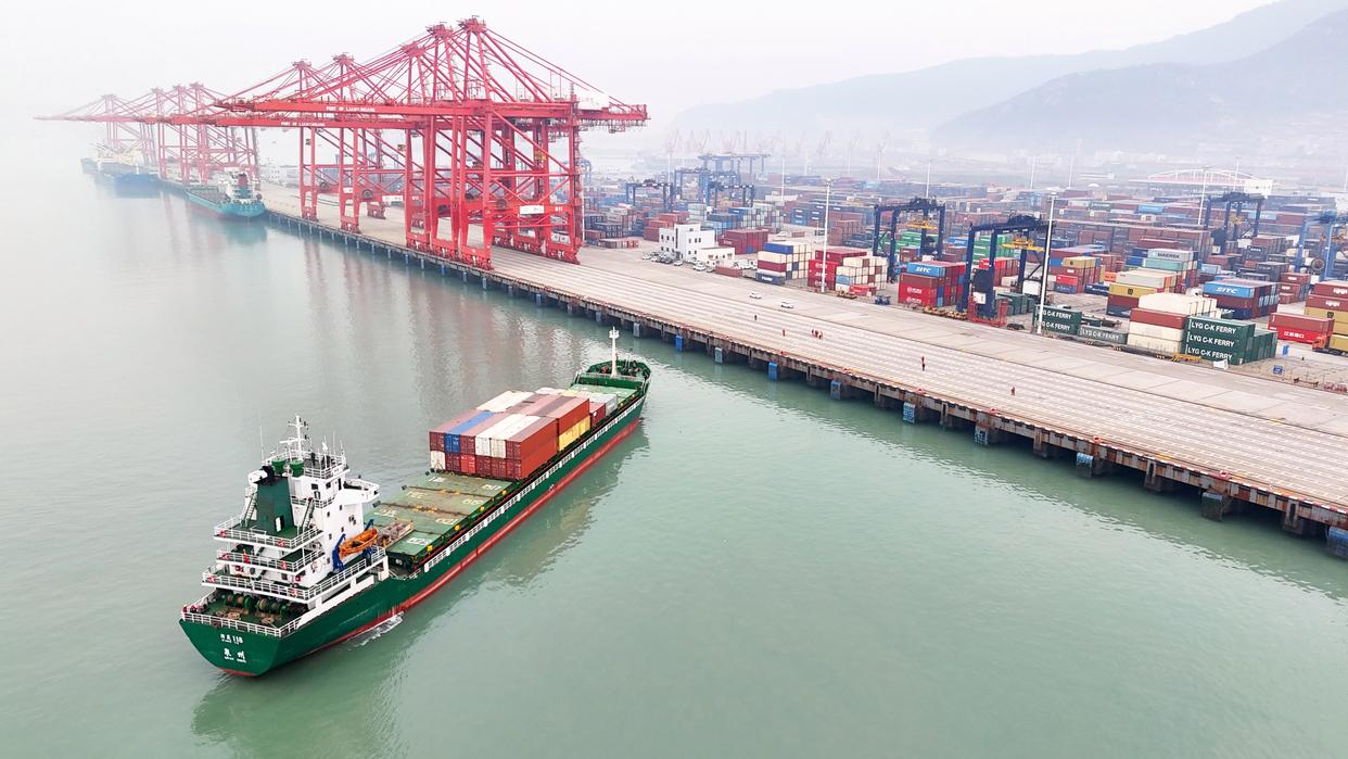 以上图片:2026年1月14日在江苏连云港港集装箱码头拍摄的船只。(无人机照片)CICPHOTO/耿玉和 摄