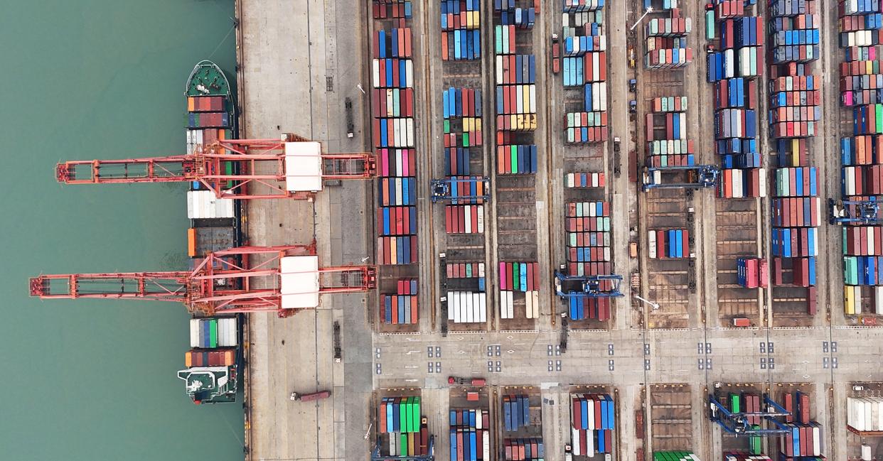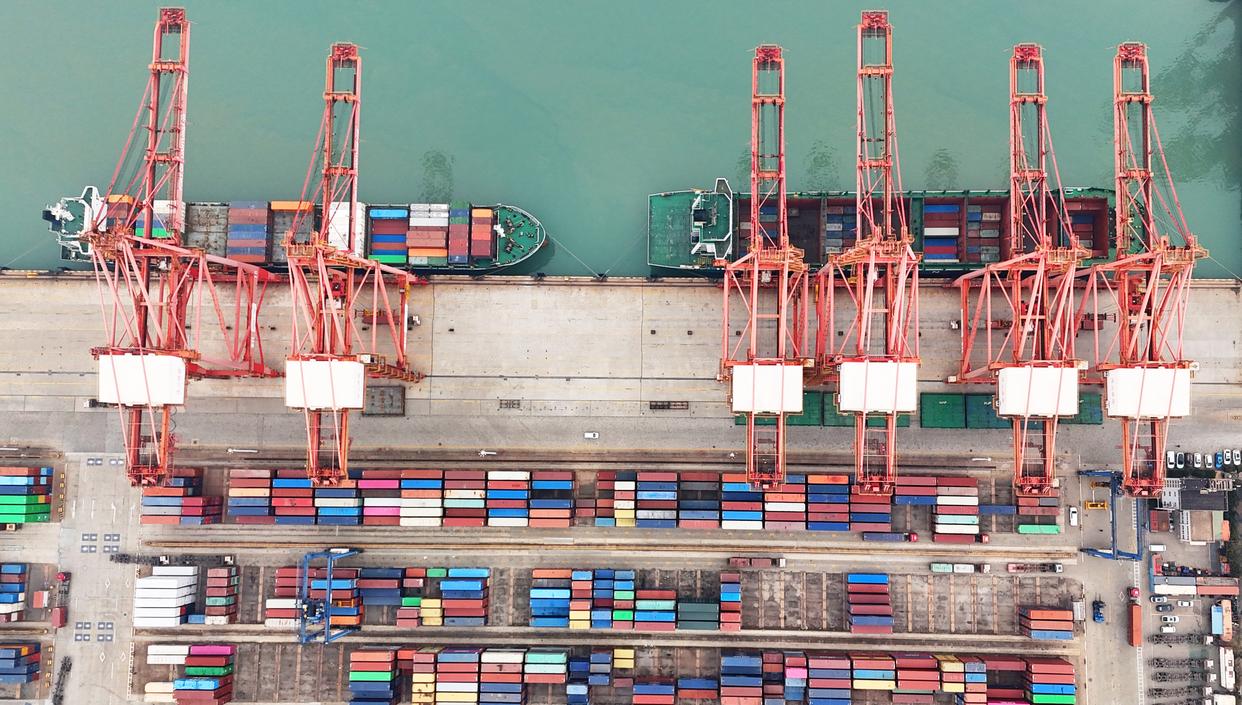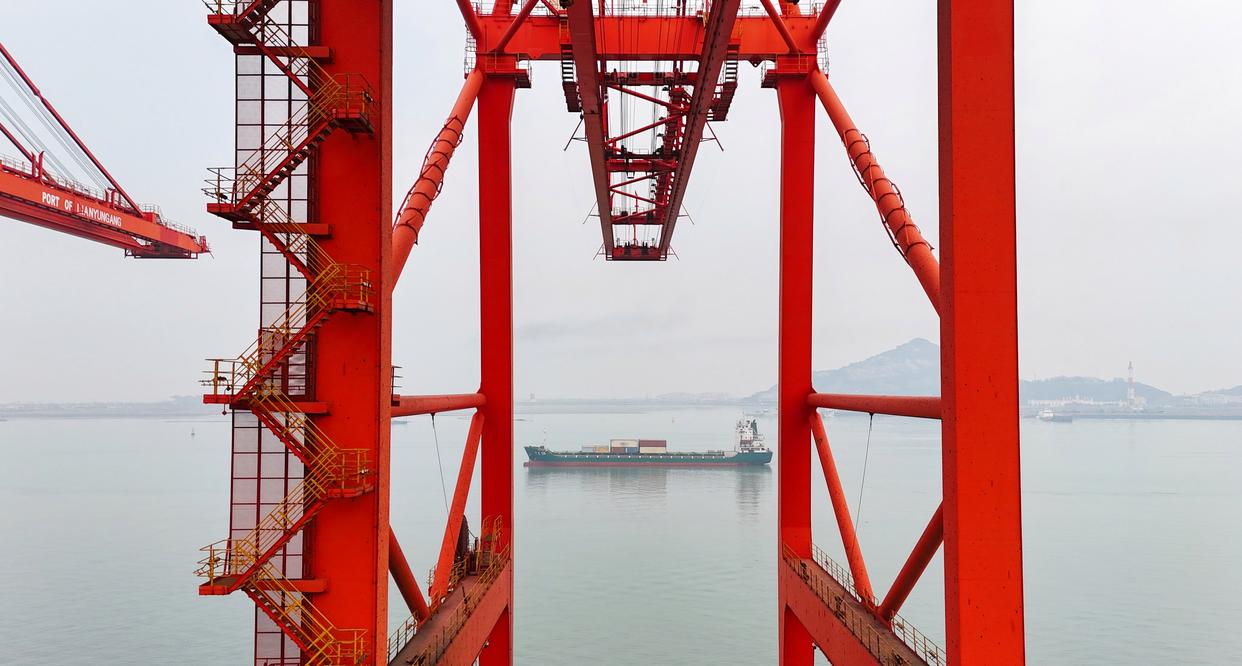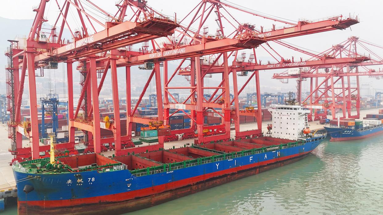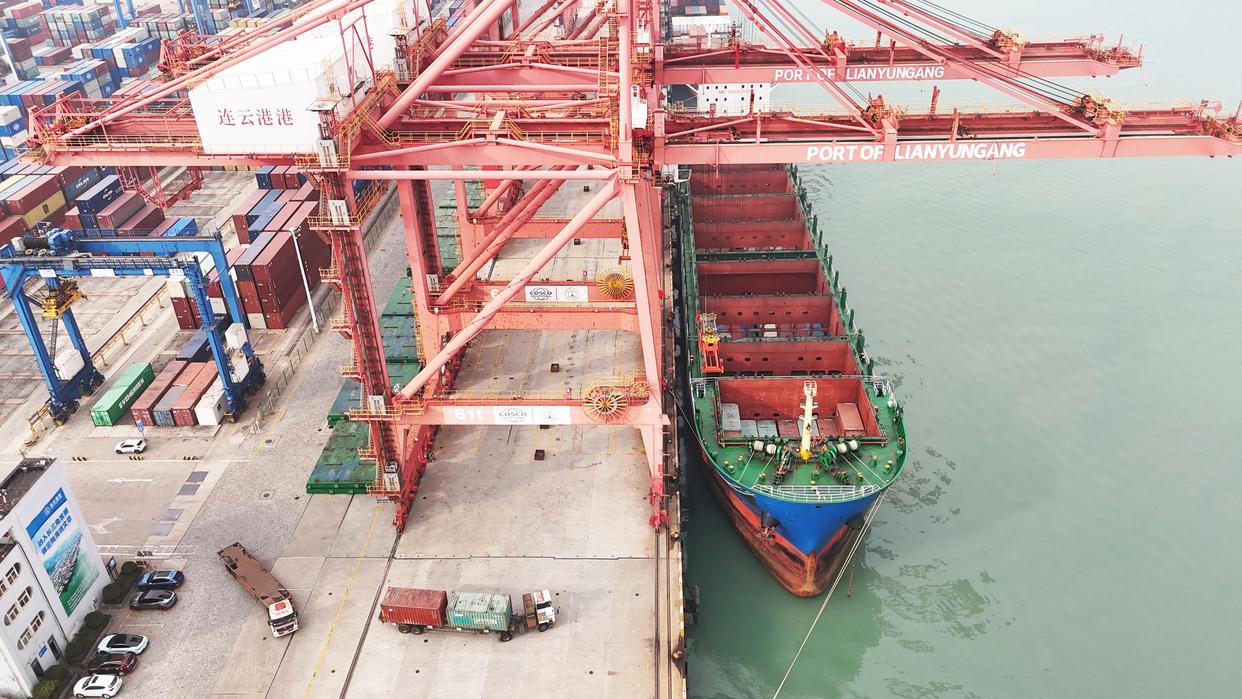 在江苏连云港港集装箱码头,船只忙碌地装卸货物。