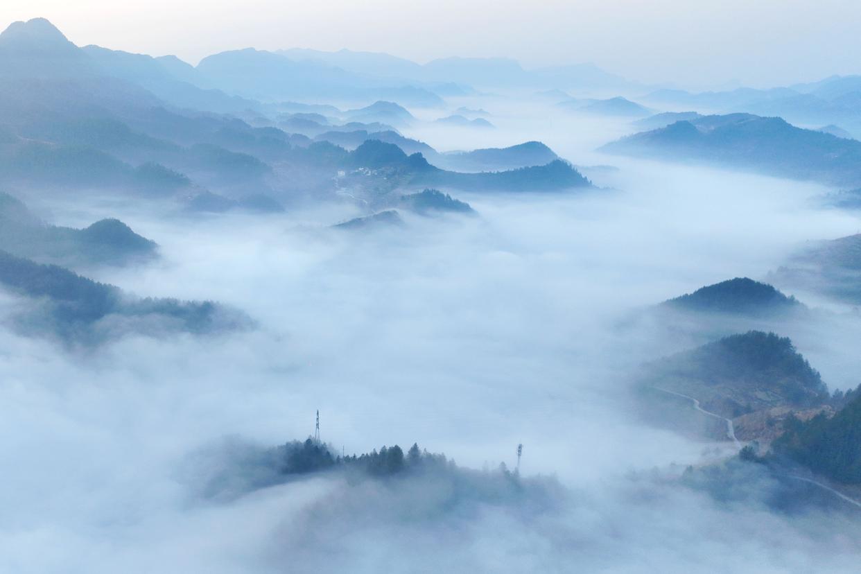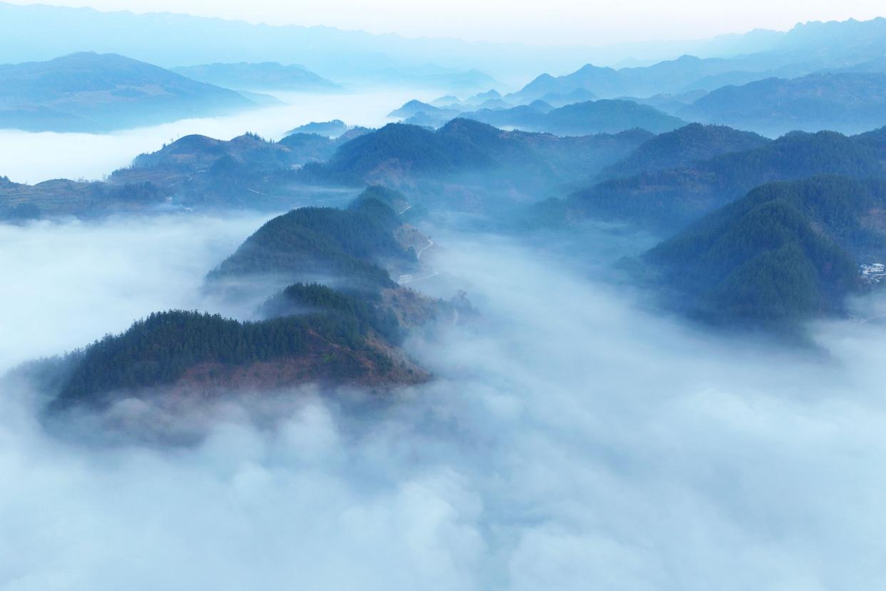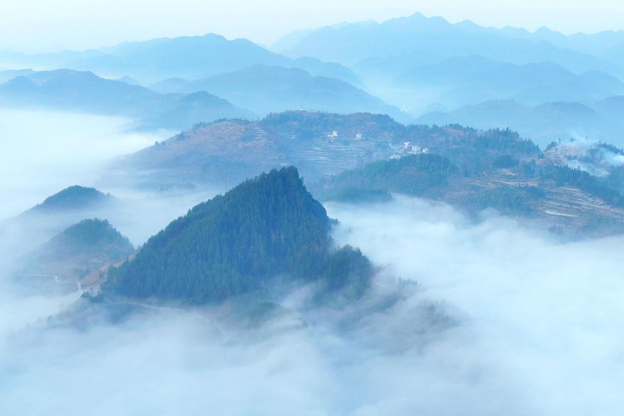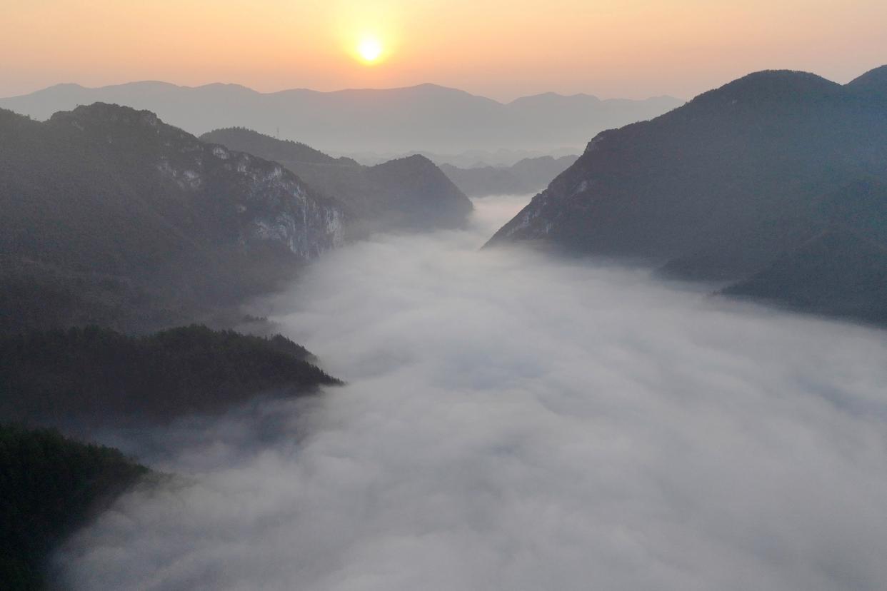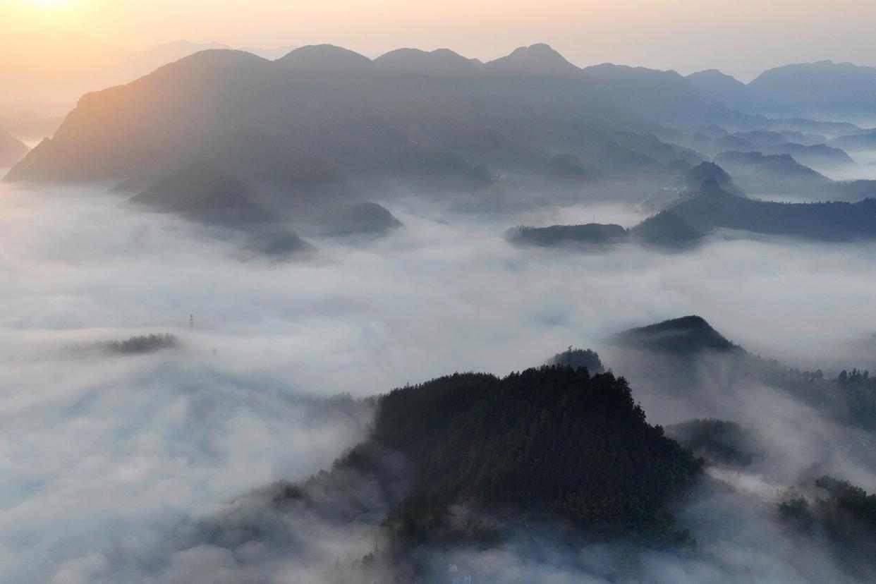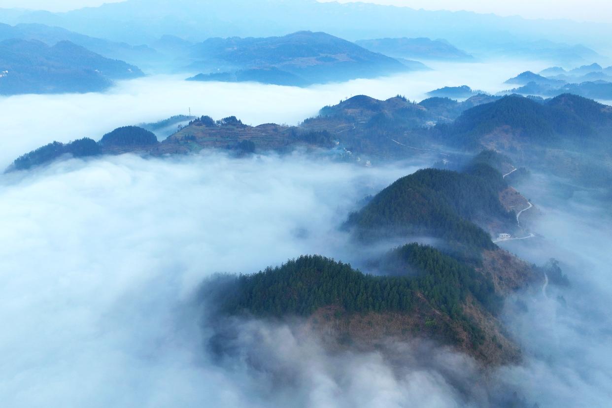 在重庆市酉阳土家族苗族自治县丁市镇岩门底,山谷间的晨雾如浪涛般漫过黛色峰丛。云雾似纱,与阳光相互映衬,形成一幅幅美丽的冬日画卷。
