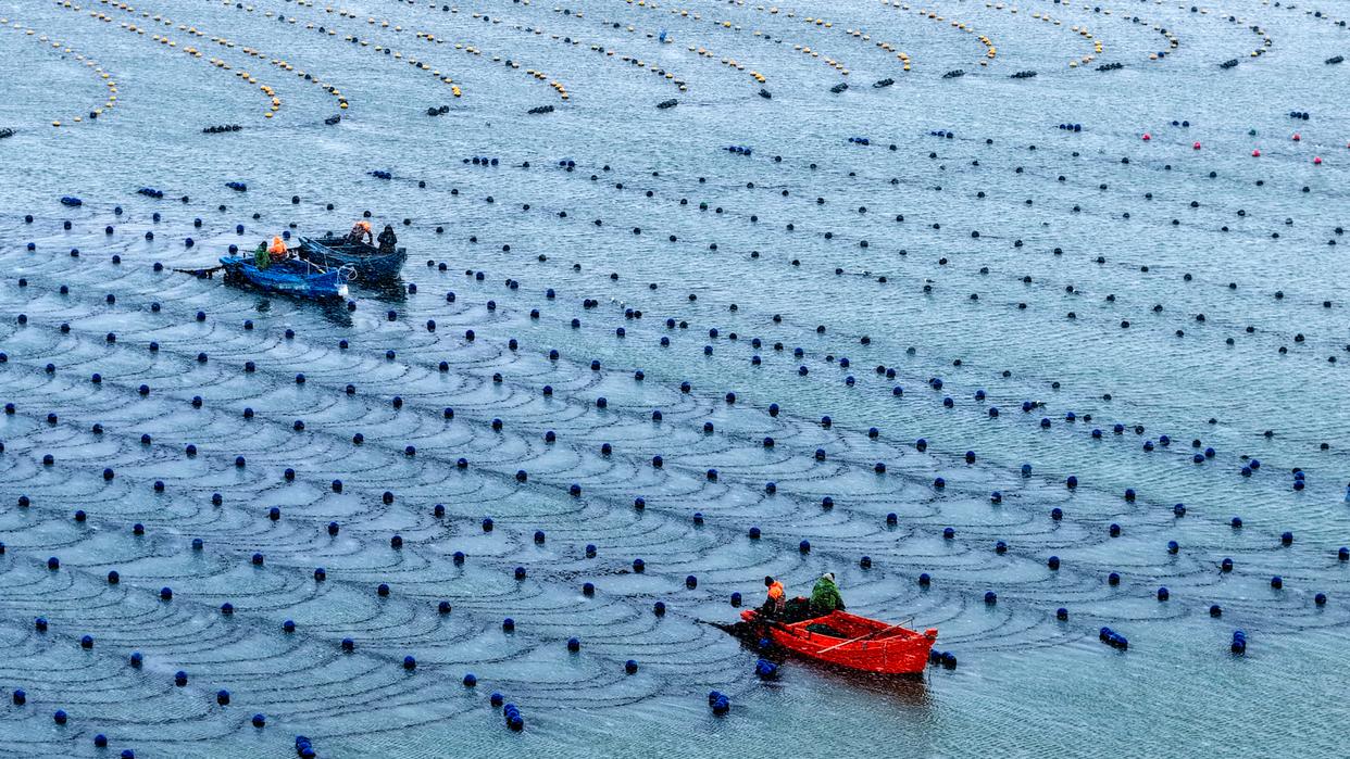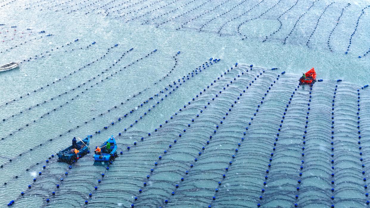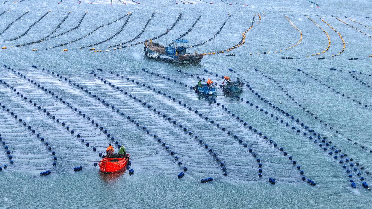 以上图片:2026年1月21日,山东省荣成市爱伦湾海洋牧场,渔民们在雪中进行海上养殖管理作业。(无人机照片)CICPHOTO/杨志礼 摄