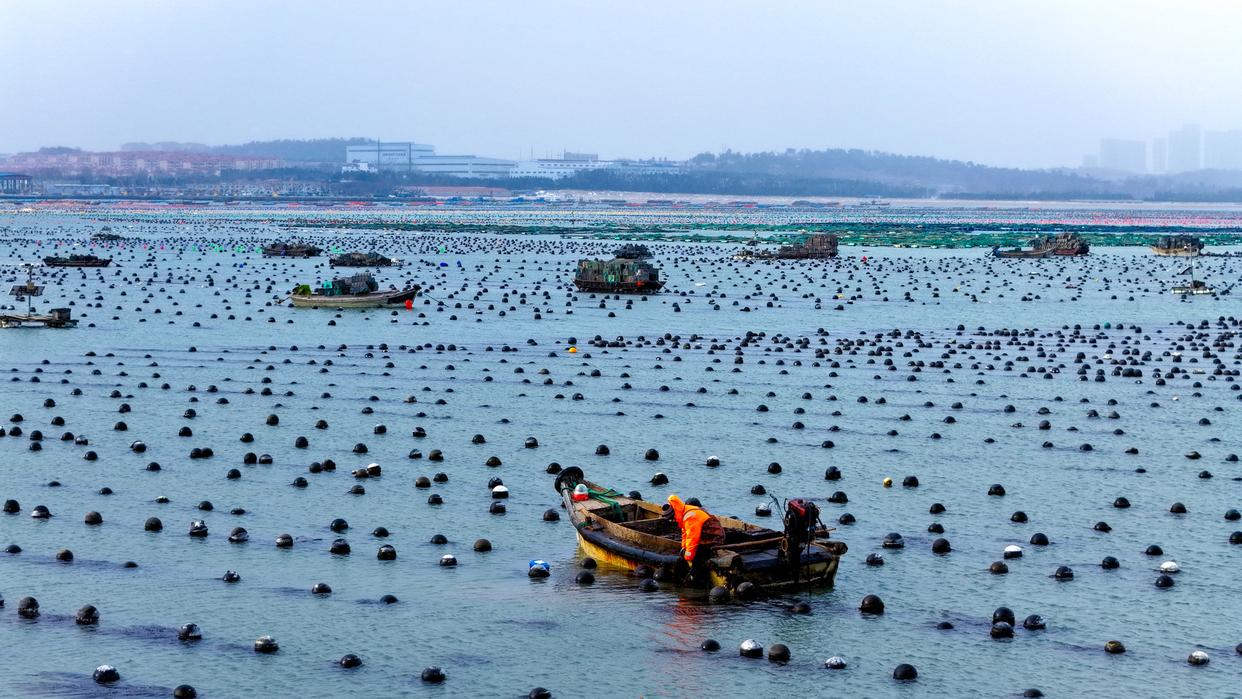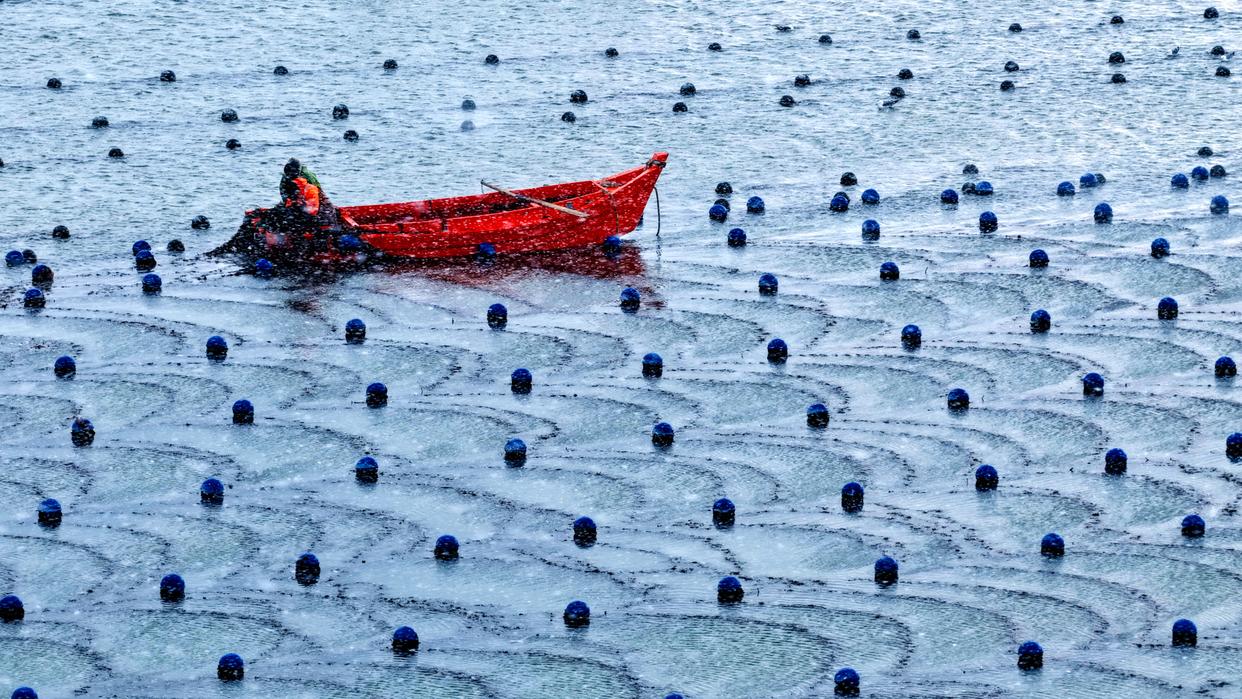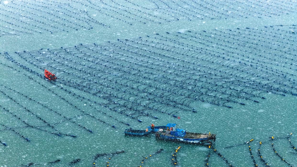 2026年1月21日,山东省荣成市爱伦湾海洋牧场,渔民们冒着严寒,顶着大雪驾驶渔船进行海上养殖管理作业,呈现一派雪中“海上冬耕”的繁忙景象。