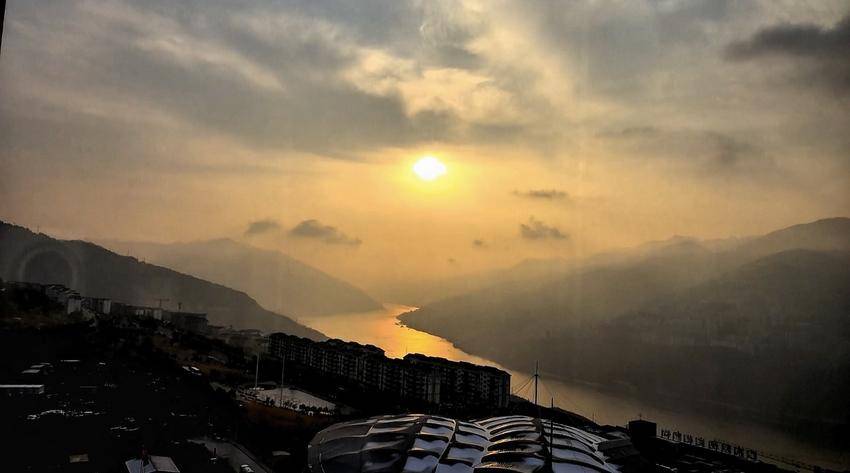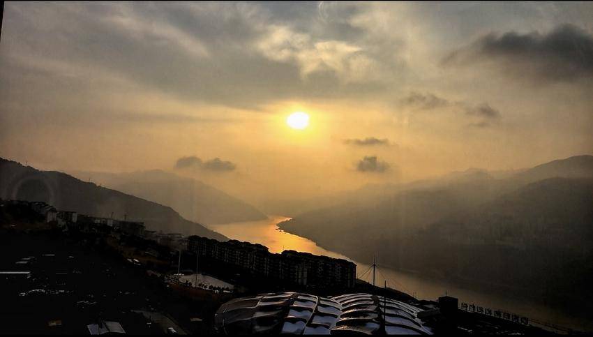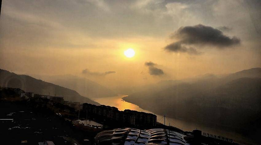 1月22日清晨,长江巴东巫峡口东边的天际泛红,冬日暖阳缓缓升起,驱走寒意和乌云,积雪也慢慢融化,云雾如絮,江光似金,宛如一幅流动的风景线。