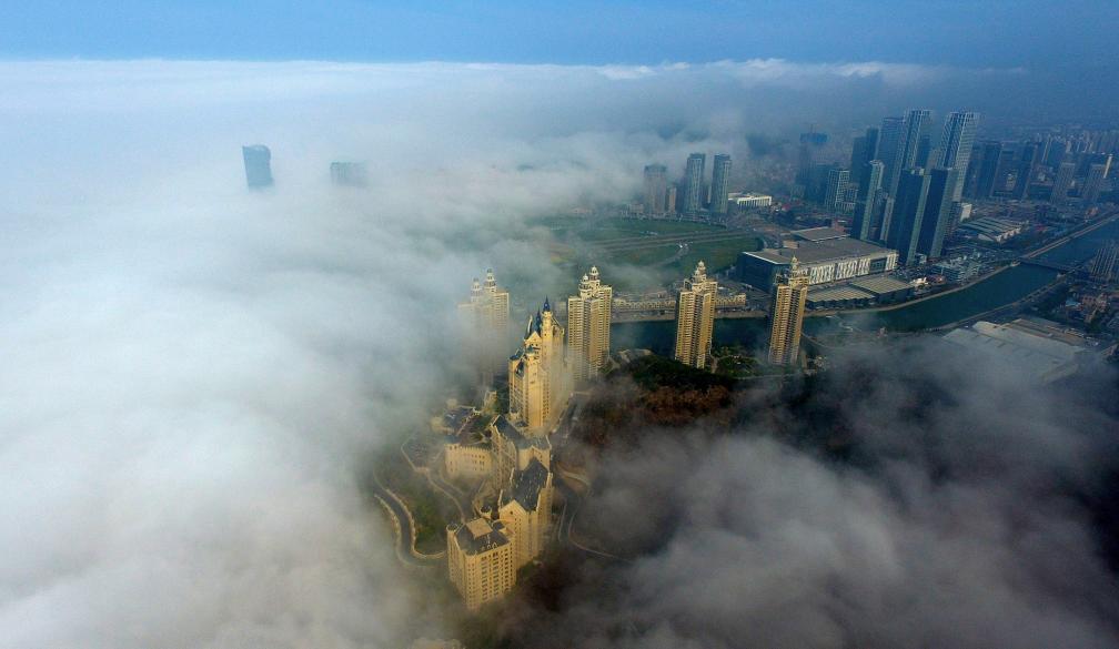 平流雾笼罩下的大连星海湾(2017年5月3日摄)。 新华社发(吕文正 摄)