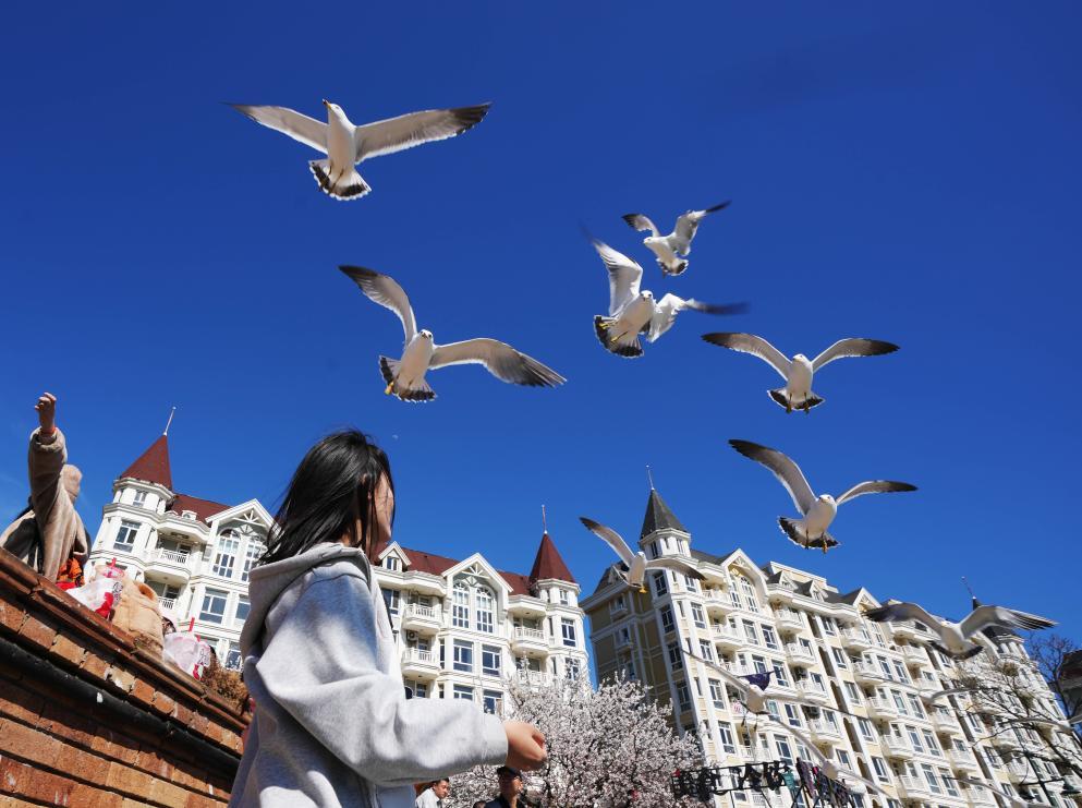 2024年4月16日,游人在大连老虎滩渔人码头喂食海鸟。新华社记者 李钢 摄