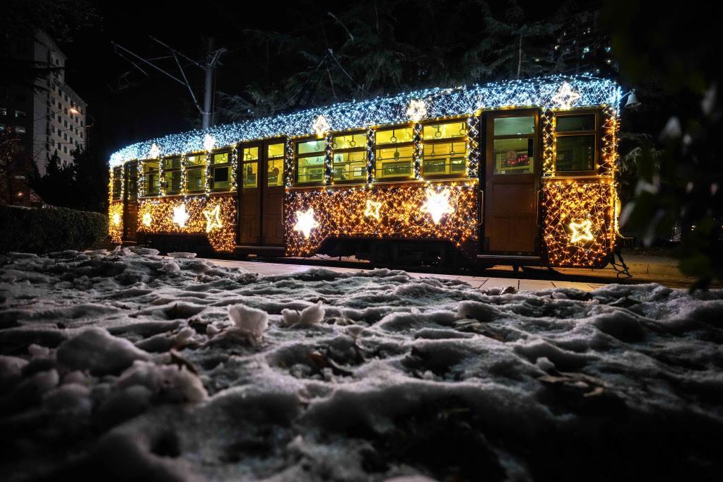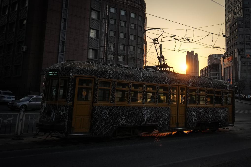 在大连民主广场站附近拍摄的201路有轨电车(2024年1月9日摄)。新华社记者 潘昱龙 摄