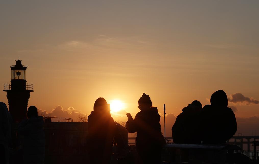 2026年1月1日,游客在大连星海广场海边观看日出。 新华社记者 李钢 摄