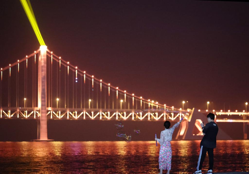 游客观赏大连星海湾大桥的光影秀(2024年5月23日拍摄)。新华社记者 李钢 摄