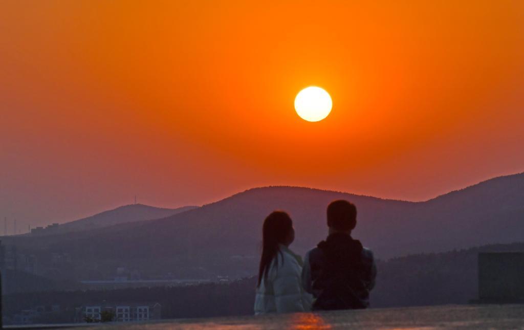 2023年4月29日,游客在辽宁省大连市白玉山景区欣赏夕阳。新华社记者 杨青 摄