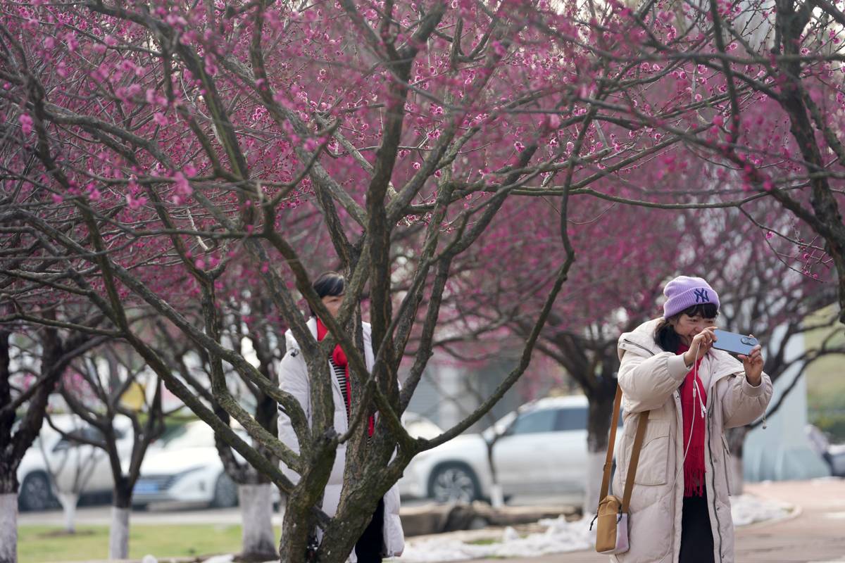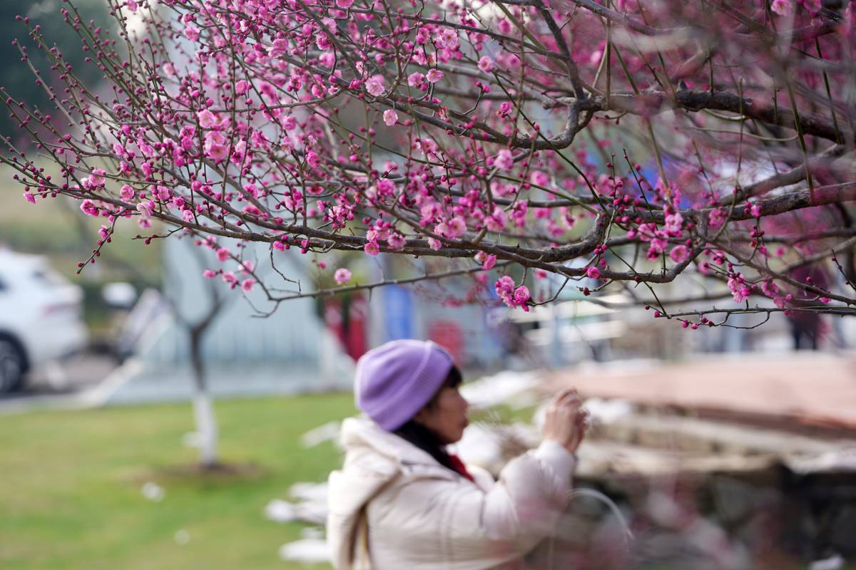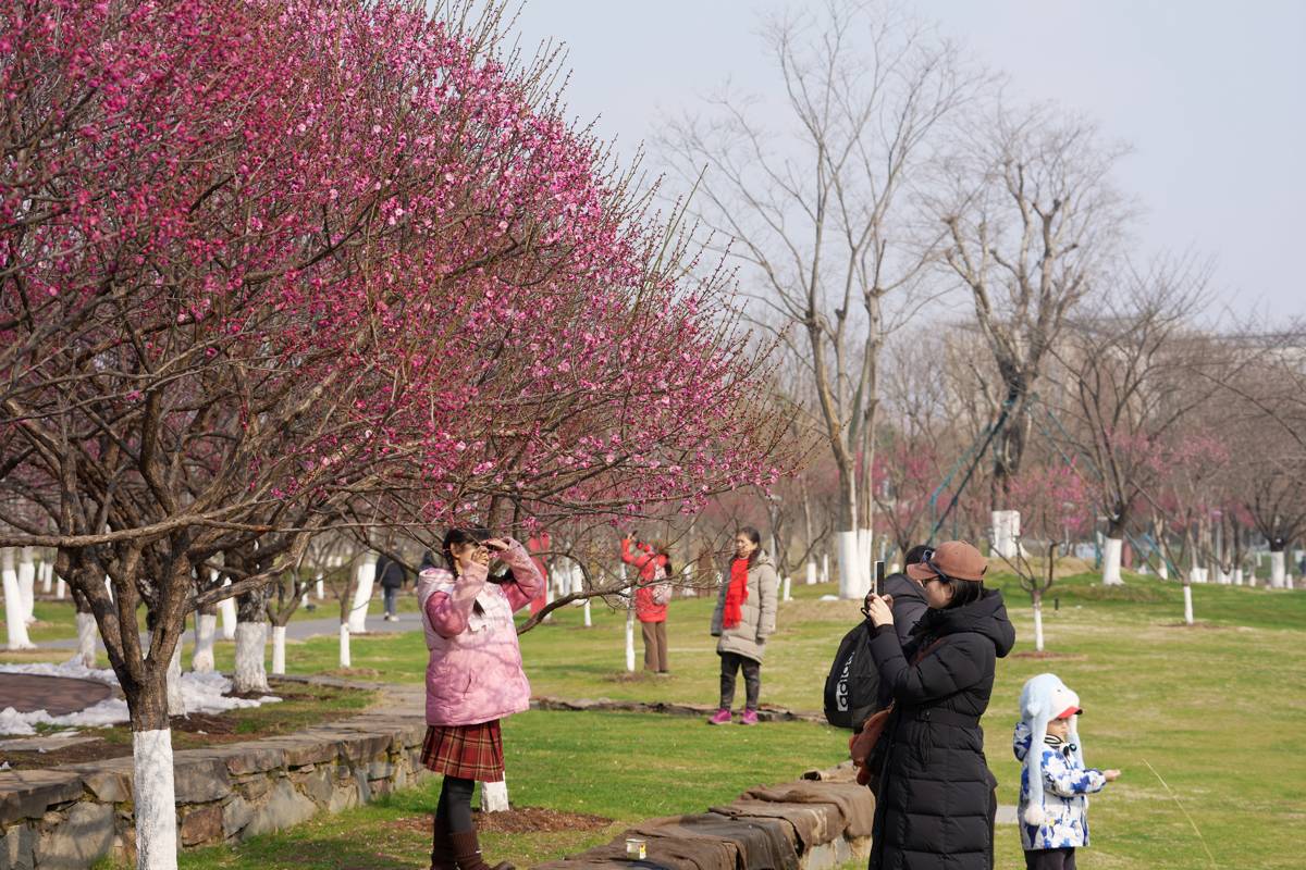 1月22日,武汉东湖高新区西苑公园,市民在空轨下赏梅、打卡。近日,武汉园林部门发布的“2026年赏梅地图”中,全市116座城市公园被标注为赏梅好去处,其中39座公园种植梅花超百株,10座公园梅树数量超过500株。近年来,“春赏樱、夏看荷、秋品桂、冬观梅”,四季繁花轮番登场江城。伴随着城市更新和“湿地花城”建设,武汉每年新、改建公园百余座。在新公园建设、老公园升级过程中,市、区园林和林业部门有意识地种上梅花,强化“冬观梅”的城市四季花卉特色。(湖北日报全媒记者魏铼摄)