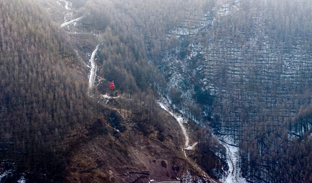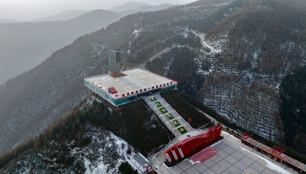 这是1月25日在宁夏固原市隆德县境内拍摄的六盘山红军长征旅游区一景(无人机照片)。新华社记者 杨植森 摄