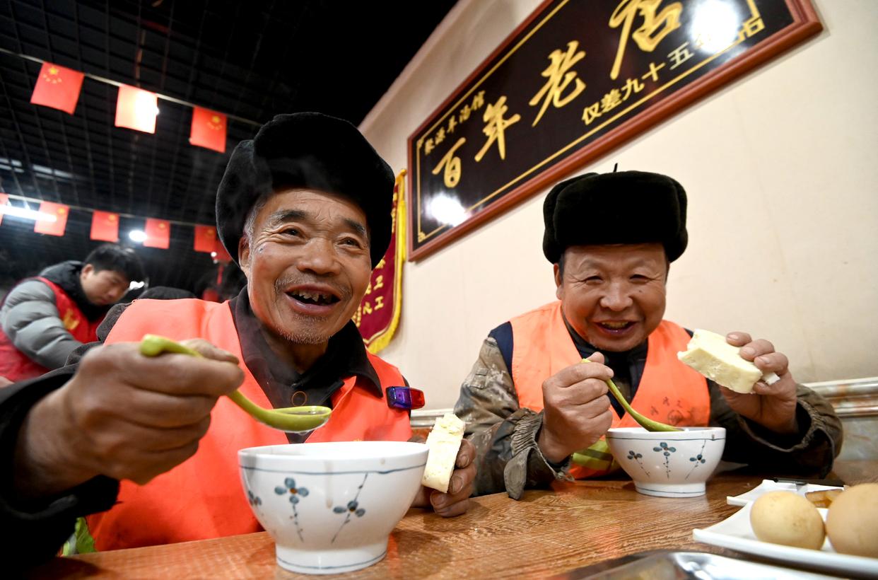 1月26日,环卫工人在河北省邯郸市峰峰矿区一家餐厅品尝腊八粥。新华社发(郝群英 摄)