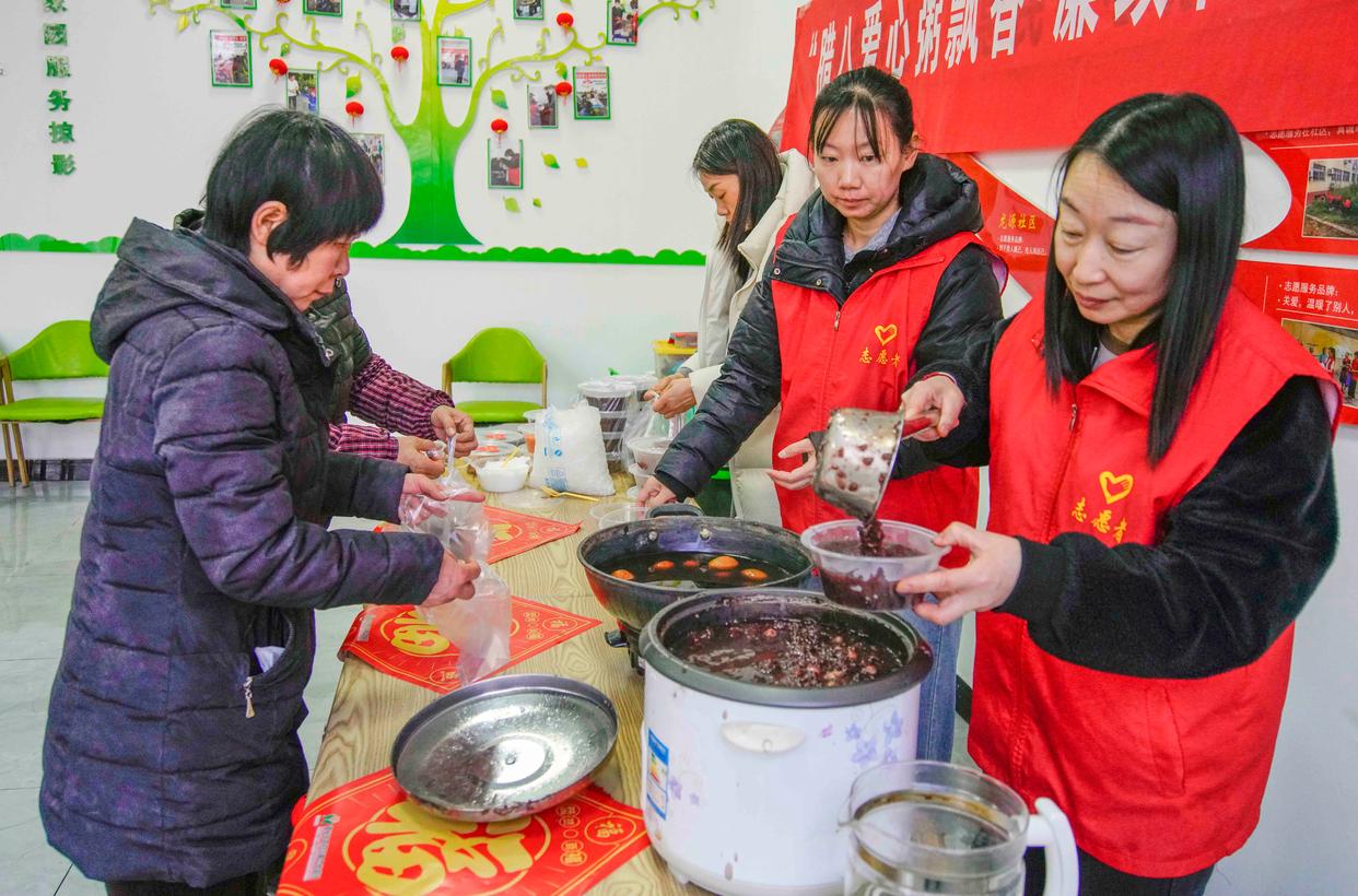 1月26日,河北省遵化市文化路街道文柏社区的志愿者给居民盛腊八粥。新华社发(刘满仓 摄)