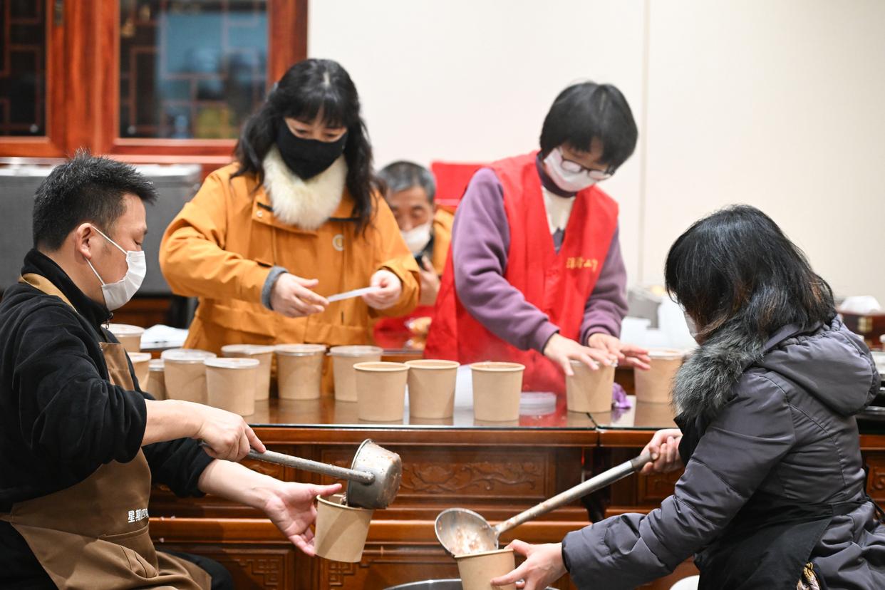 1月26日,江苏省南京市清凉寺的工作人员在分发腊八粥。新华社发(杨素平 摄)