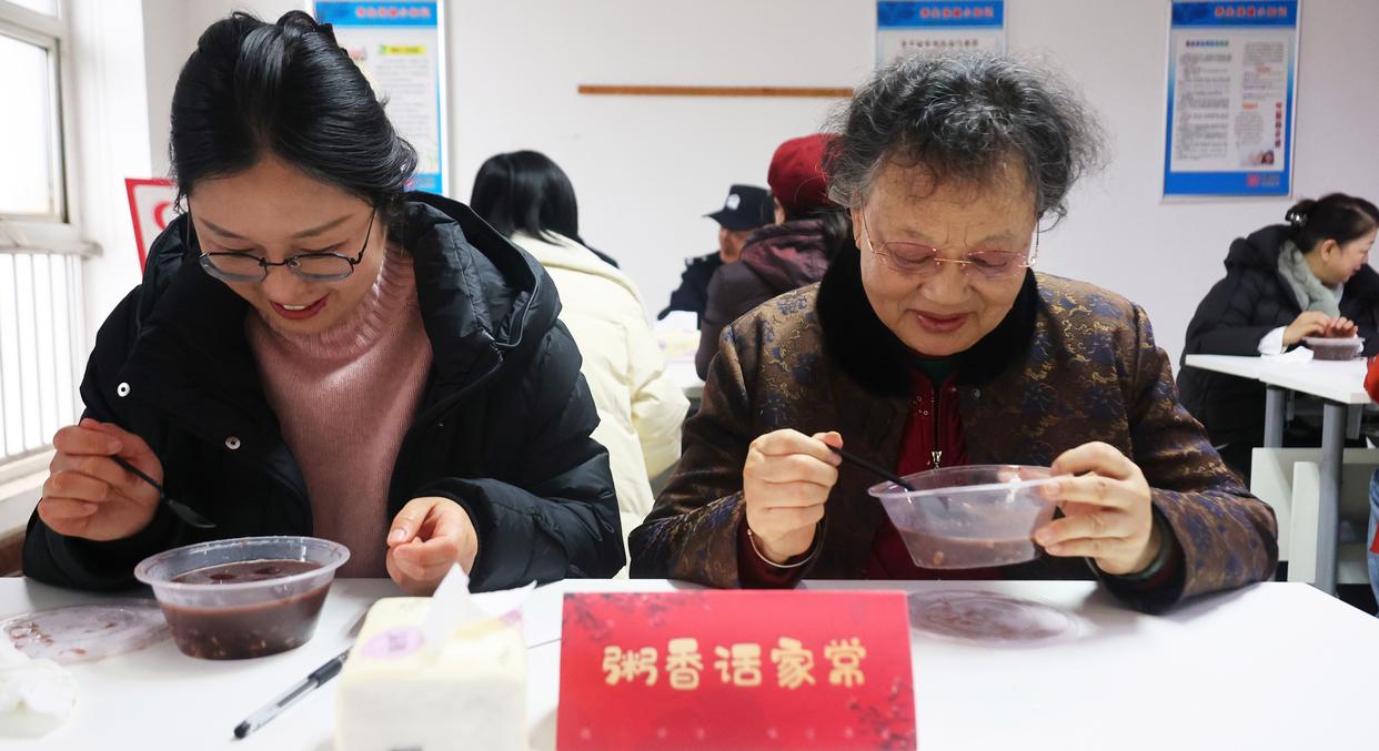 1月26日,江苏省连云港市海州区郁洲街道河滨社区,人们在腊八节温情茶话会上品尝腊八粥。新华社发(耿玉和 摄)