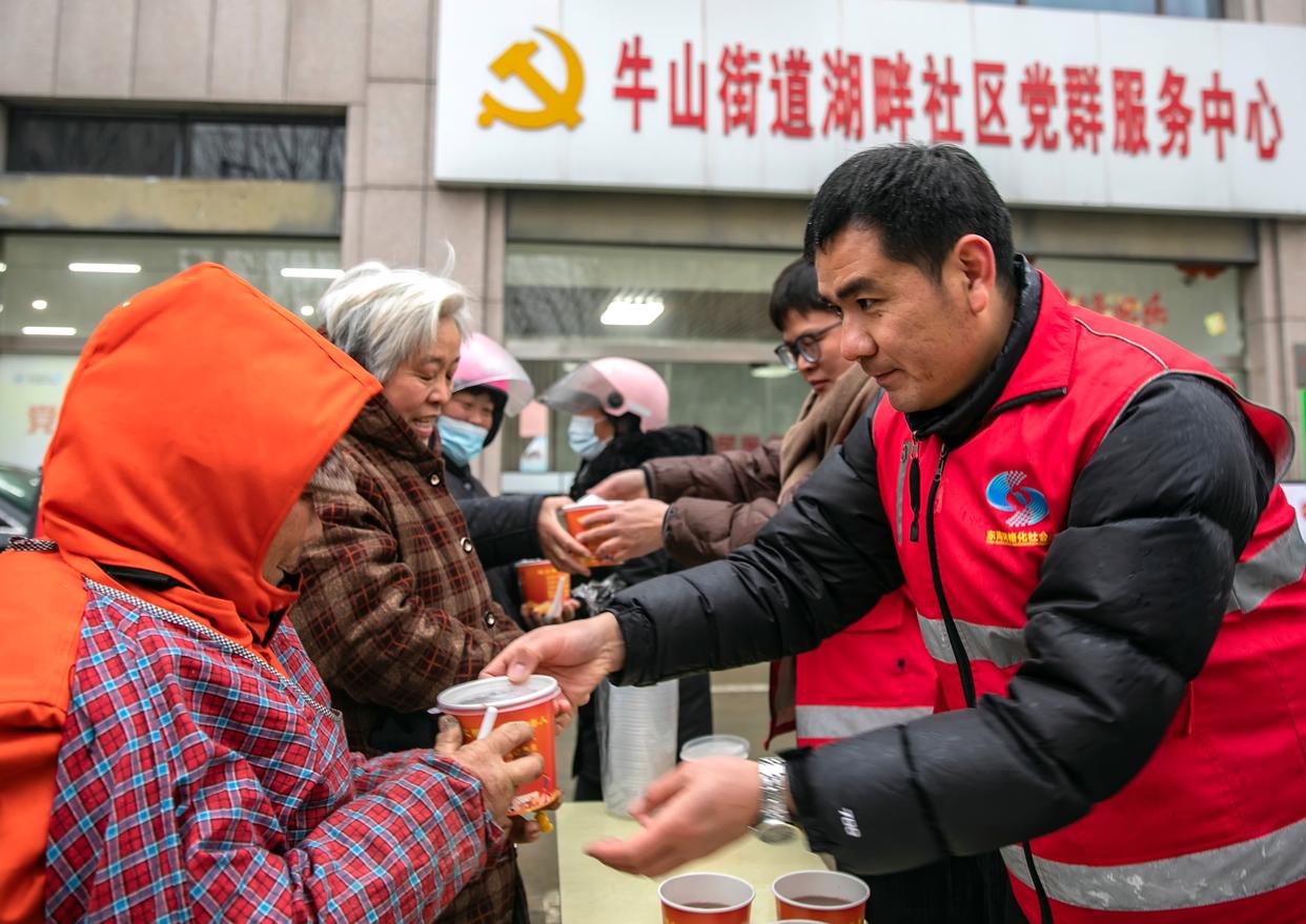 1月26日,江苏省连云港市东海县牛山街道湖畔社区门前,志愿者为市民分发腊八粥。新华社发(邵光明 摄)