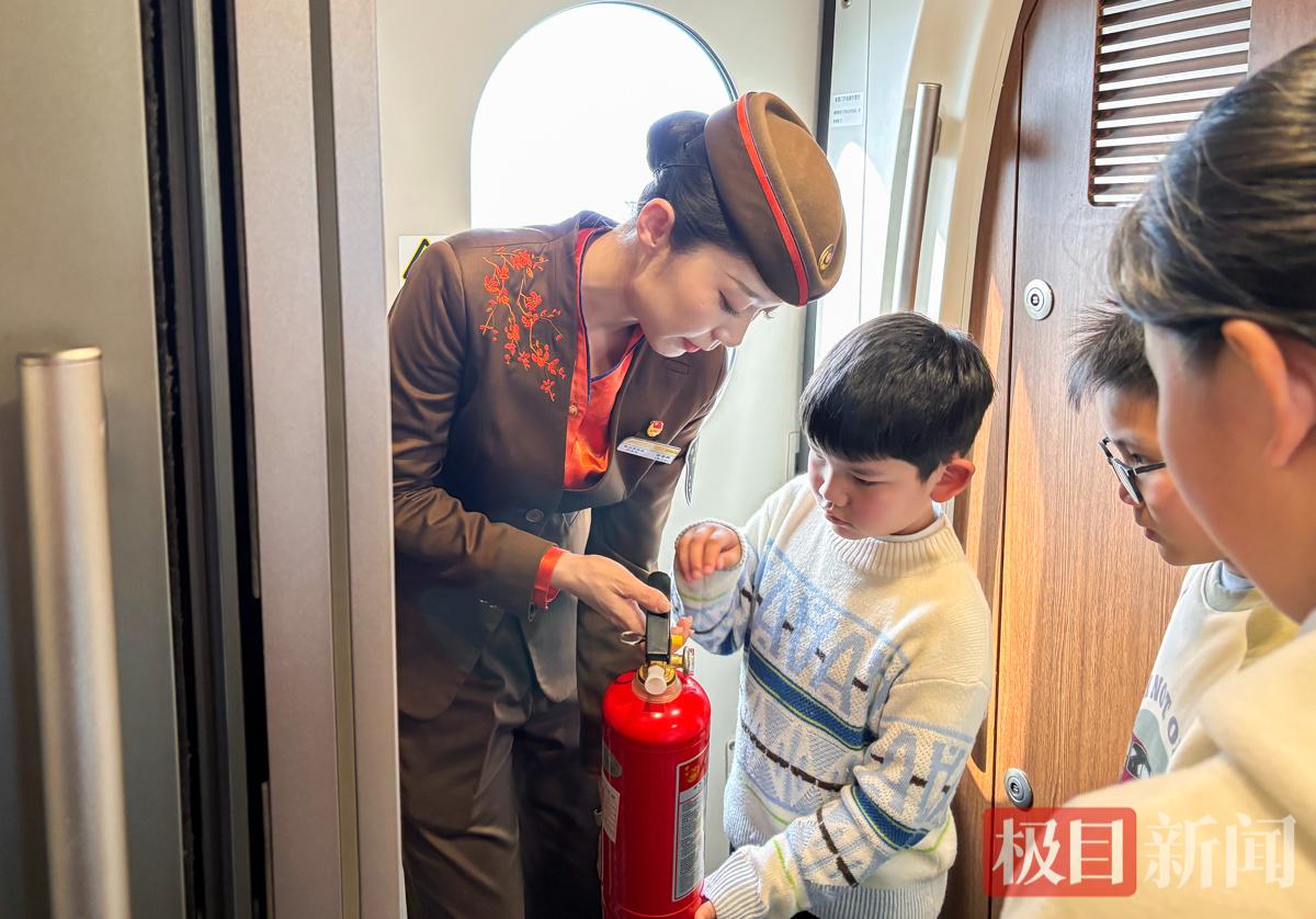 为了让安全理念更加可感可知,乘务组在车厢连接处设置了临时应急设备体验区。列车长与列车员化身“安全导师”,为旅客特别是小朋友们演示了灭火器的正确使用方法,并邀请大家上手模拟操作。这种直观的互动,既展示了乘务团队的专业素养,也有效提升了旅客的应急意识。