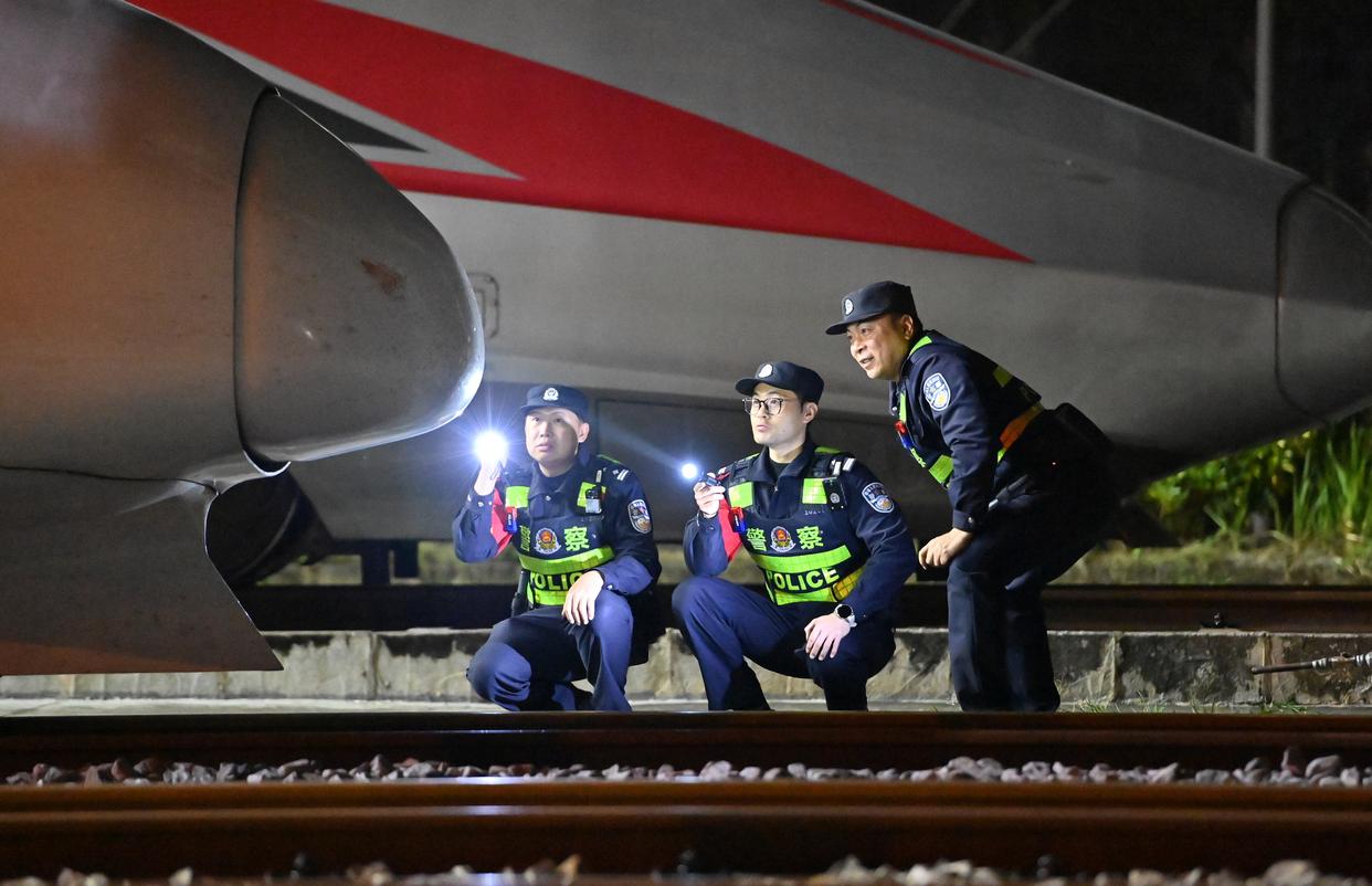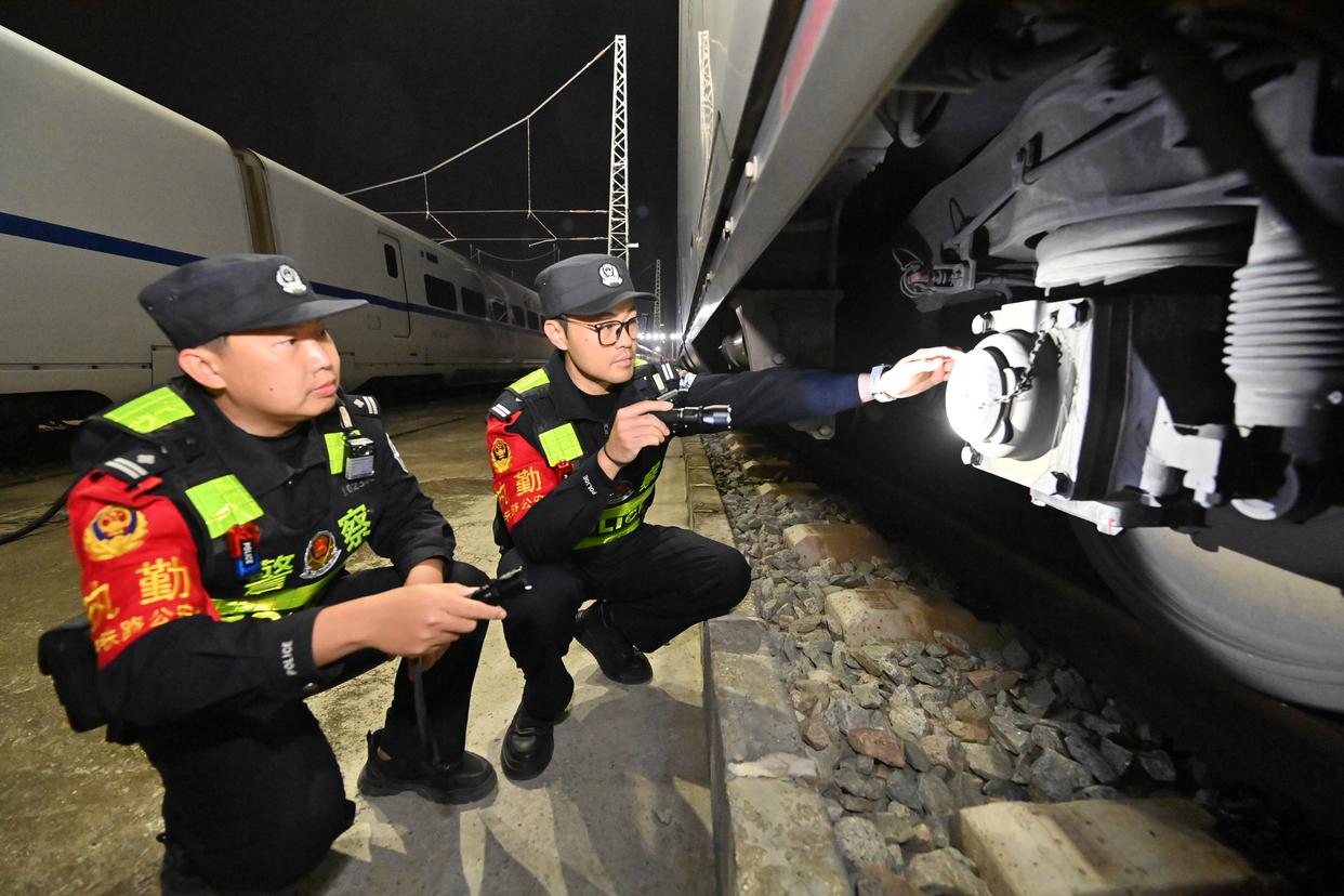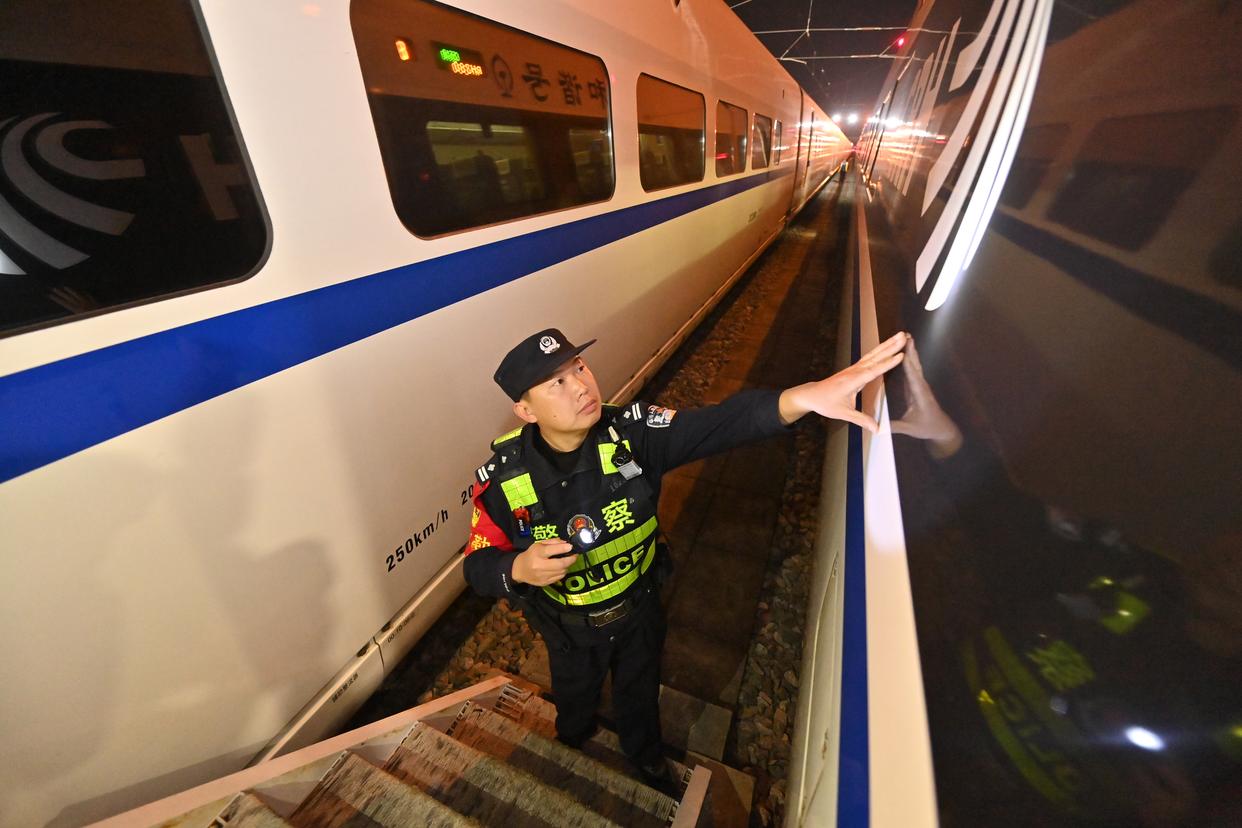 2月2日凌晨,南宁铁路公安局南宁公安处长岗岭站派出所民警在南宁动车所检查列车设备安全情况。 新华社记者 陆波岸 摄
