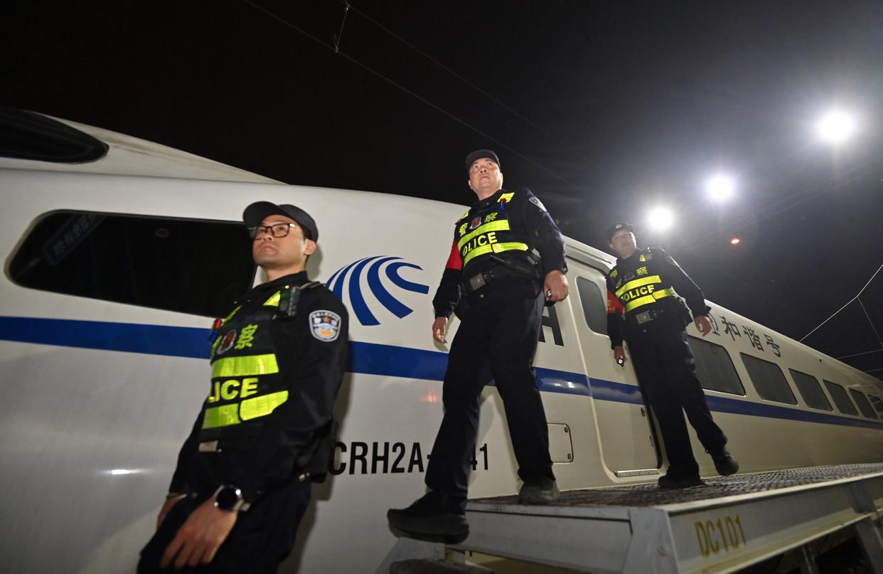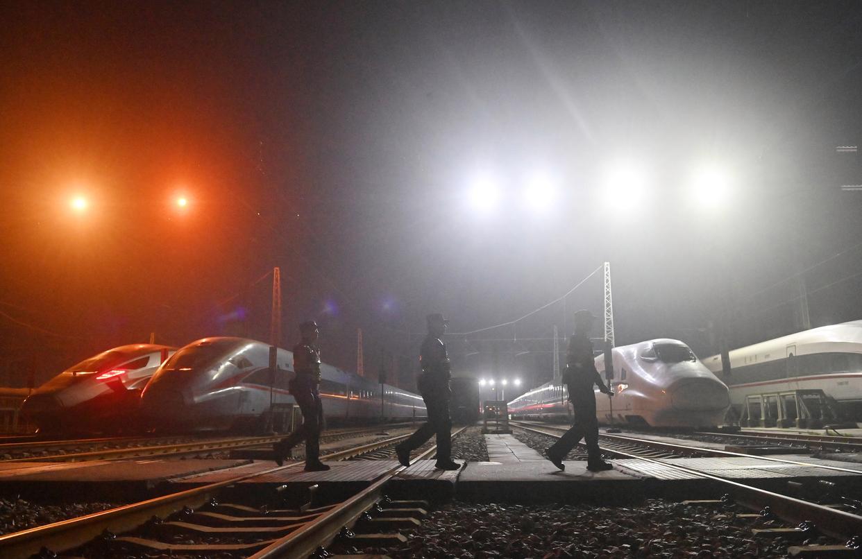 2月2日凌晨,南宁铁路公安局南宁公安处长岗岭站派出所民警在南宁动车所巡逻。 新华社记者 陆波岸 摄