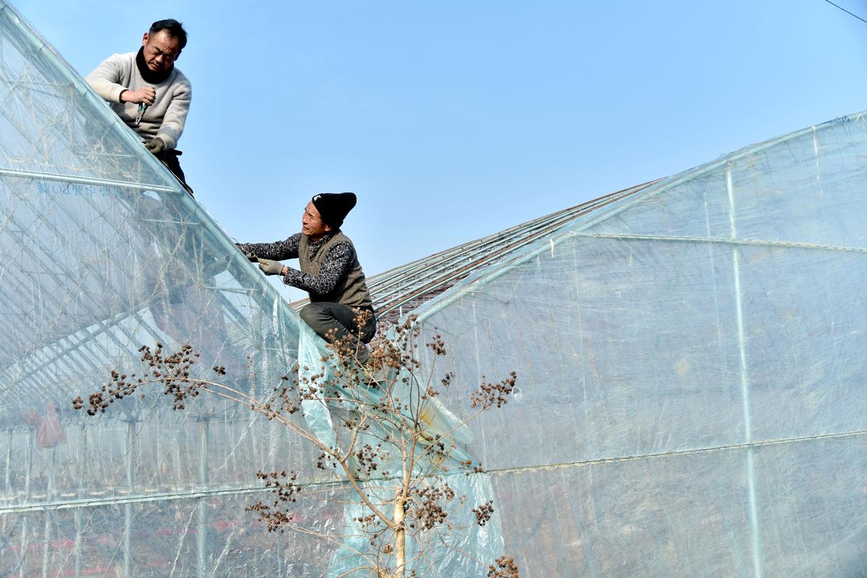 2月4日,在山东省枣庄市山亭区水泉镇,农民在建设樱桃大棚。新华社发(刘明祥摄)