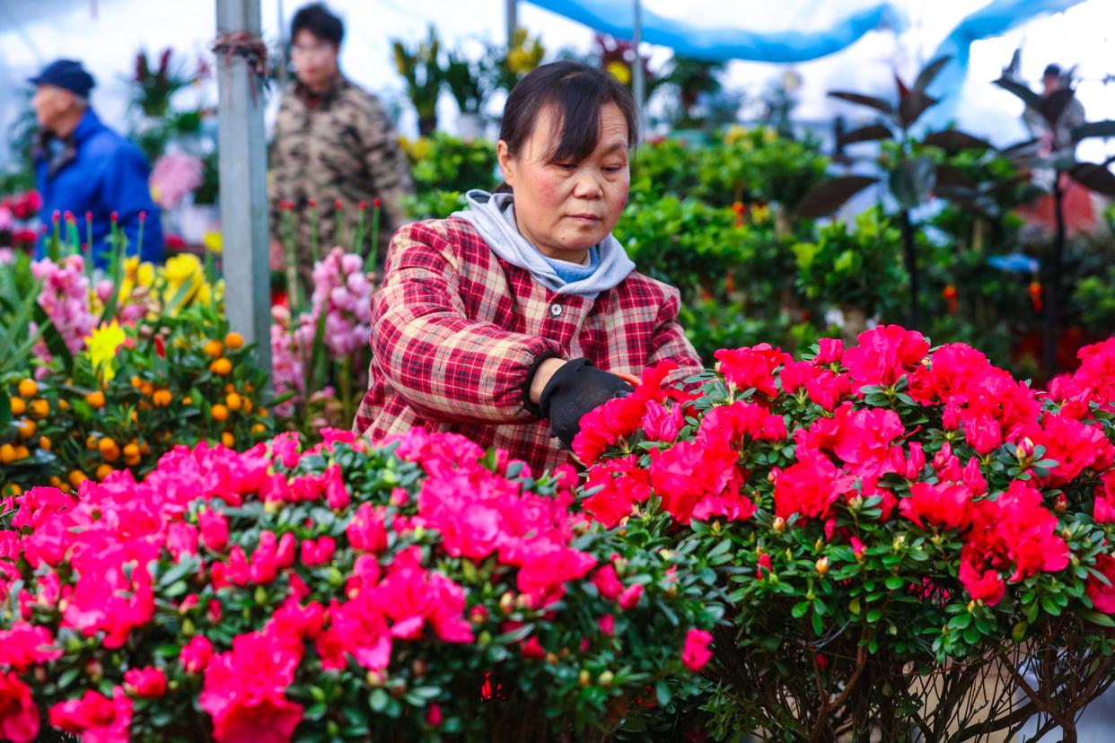 2月4日,在河南省信阳市光山县紫水街道三里桥社区一鲜花种植基地,花农在管理鲜花。新华社发(谢万柏摄)