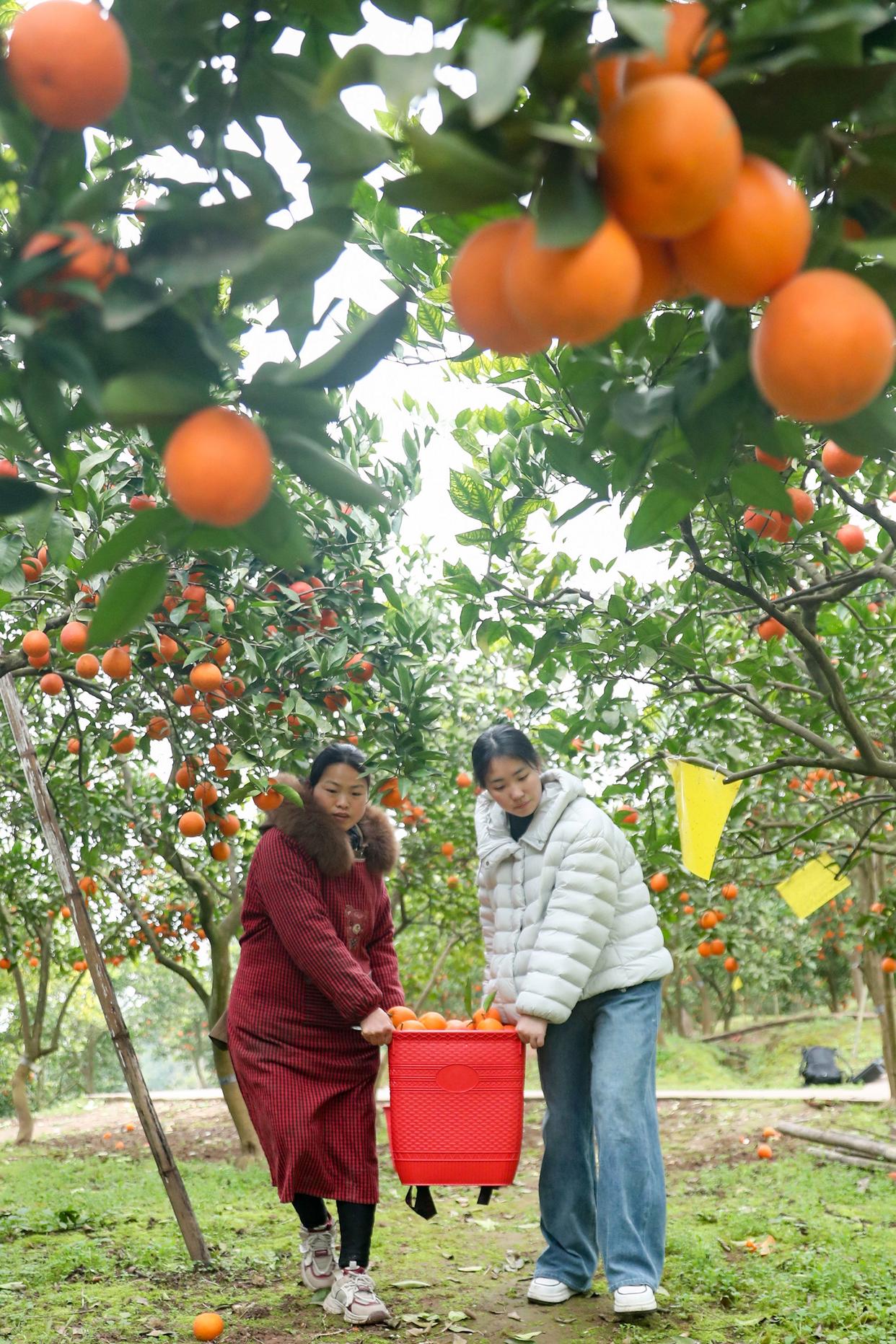 2月4日,四川省华蓥市永兴镇大佛山村村民抬运刚采摘的血橙。新华社发(邱海鹰摄)