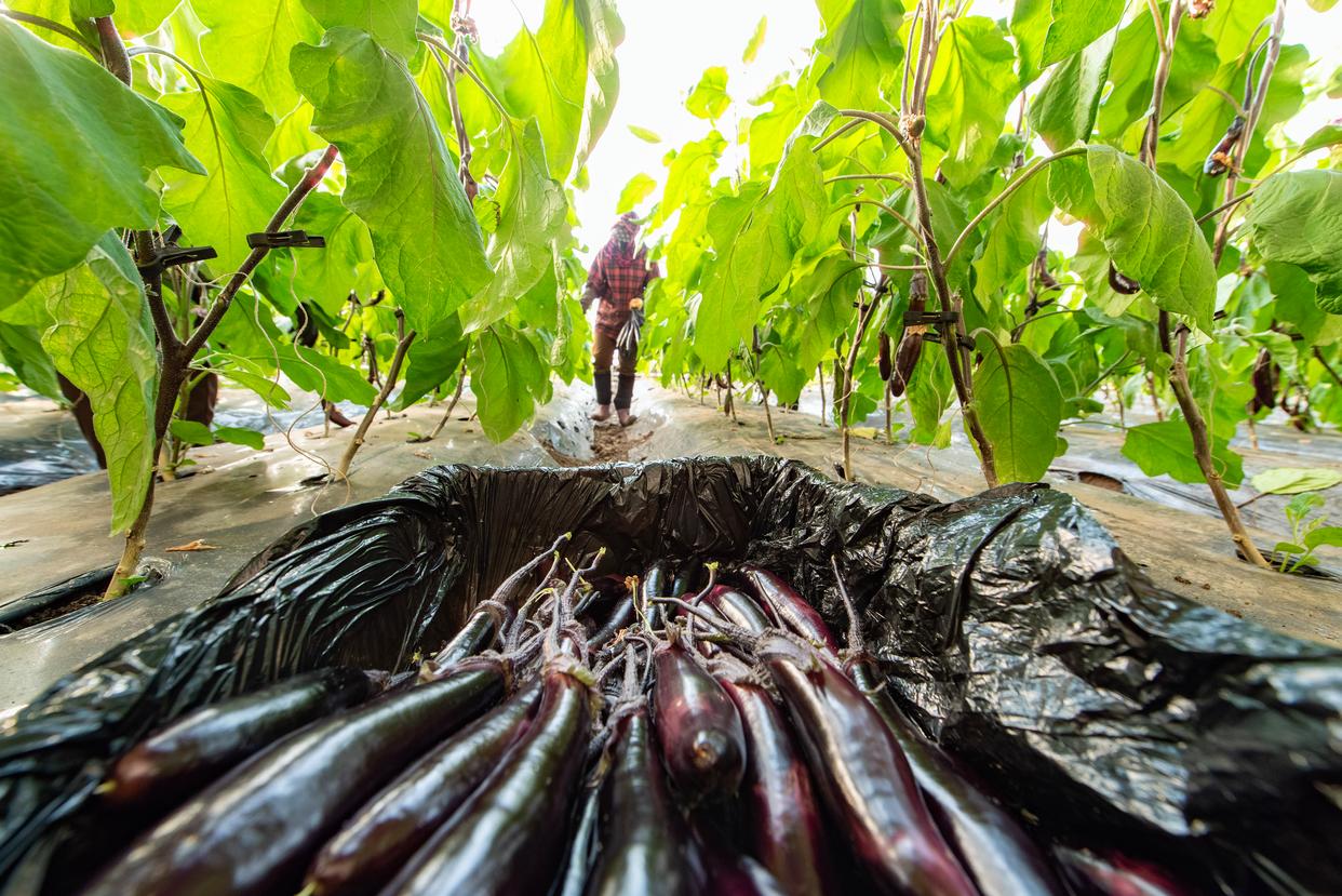 2月4日,黑龙江省富锦市一果蔬种植基地工人在大棚内采摘茄子。新华社发(曲玉宝摄)