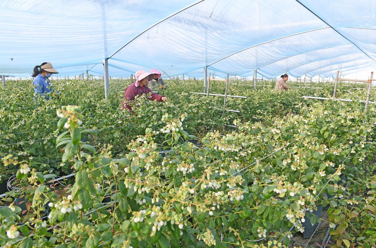 2月4日,在河南省商丘市夏邑县太平镇太平西村蓝莓园,农民为蓝莓疏花疏果。新华社发(苗育才摄)