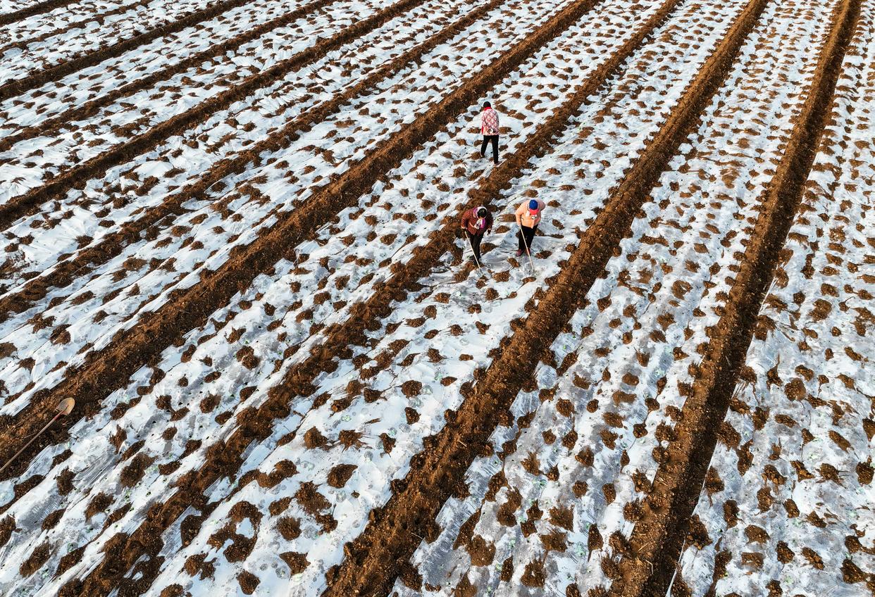 2月4日,河南省济源市克井镇农民在白菜制种田里破膜掏苗(无人机照片)。新华社发(苗秋闹摄)