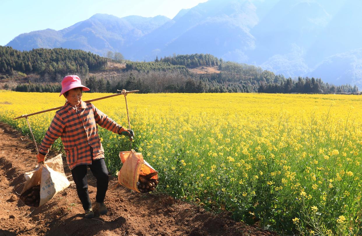 2月4日,农民在云南省腾冲市明光镇凤凰村凤凰山挑运刚采挖的山药。新华社发(龚祖金摄)